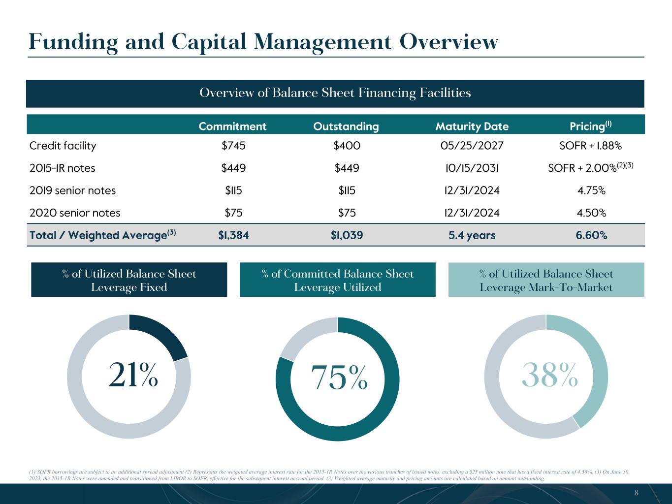 Funding and Capital Management Overview Commitment Outstanding Maturity Date Pricing(1) Credit facility $745 $400 05/25/2027 SOFR + 1.88% 2015-1R notes $449 $449 10/15/2031 SOFR + 2.00%(2)(3) 2019 senior notes $115 $115 12/31/2024 4.75% 2020 senior notes $75 $75 12/31/2024 4.50% Total / Weighted Average(3) $1,384 $1,039 5.4 years 6.60% Overview of Balance Sheet Financing Facilities 8 75% % of Committed Balance Sheet Leverage Utilized % of Utilized Balance Sheet Leverage Mark-To-Market % of Utilized Balance Sheet Leverage Fixed 21% (1) SOFR borrowings are subject to an additional spread adjustment (2) Represents the weighted average interest rate for the 2015-1R Notes over the various tranches of issued notes, excluding a $25 million note that has a fixed interest rate of 4.56%. (3) On June 30, 2023, the 2015-1R Notes were amended and transitioned from LIBOR to SOFR, effective for the subsequent interest accrual period. (3) Weighted average maturity and pricing amounts are calculated based on amount outstanding. 38%