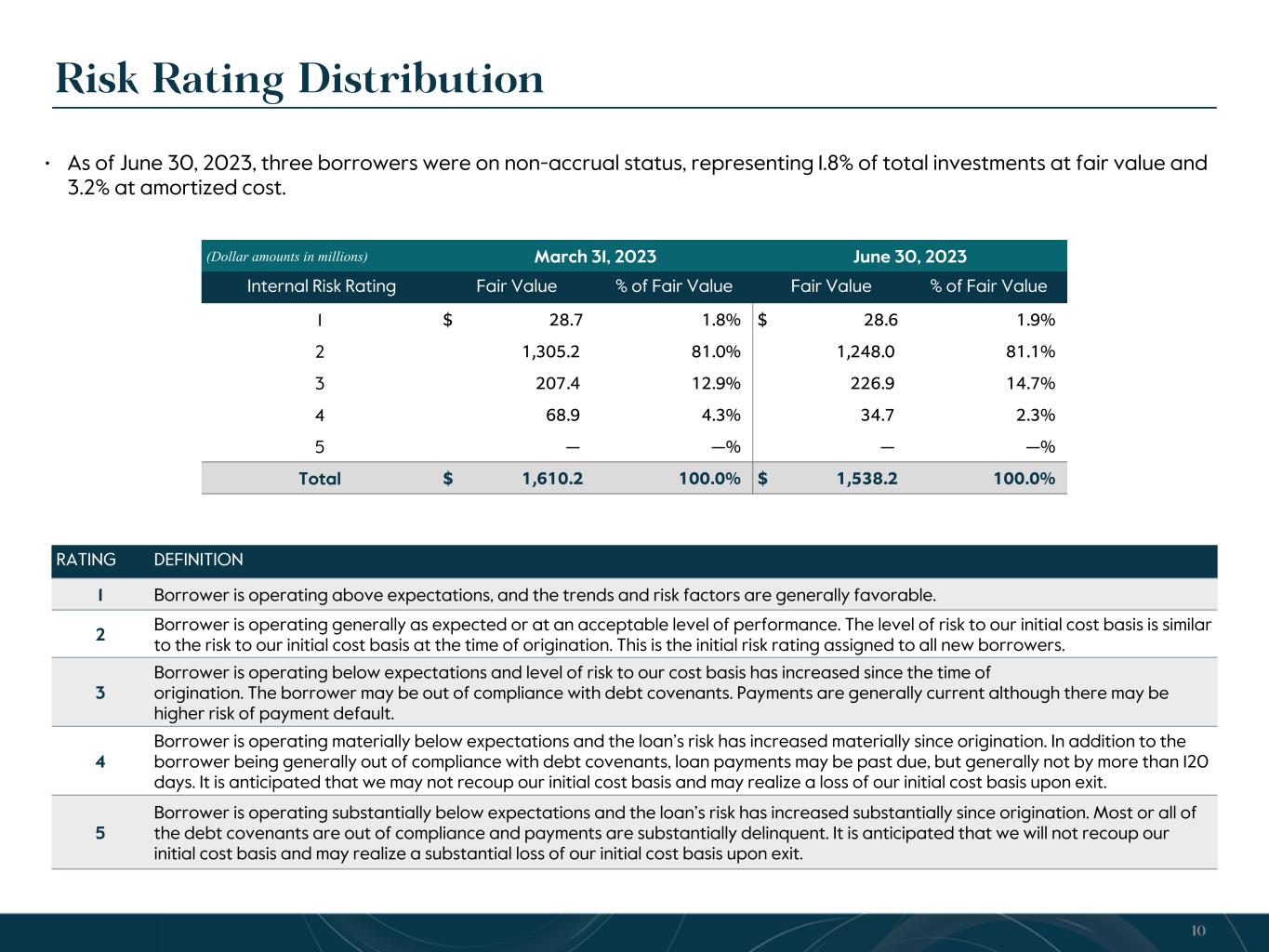 • As of June 30, 2023, three borrowers were on non-accrual status, representing 1.8% of total investments at fair value and 3.2% at amortized cost. Risk Rating Distribution RATING DEFINITION 1 Borrower is operating above expectations, and the trends and risk factors are generally favorable. 2 Borrower is operating generally as expected or at an acceptable level of performance. The level of risk to our initial cost basis is similar to the risk to our initial cost basis at the time of origination. This is the initial risk rating assigned to all new borrowers. 3 Borrower is operating below expectations and level of risk to our cost basis has increased since the time of origination. The borrower may be out of compliance with debt covenants. Payments are generally current although there may be higher risk of payment default. 4 Borrower is operating materially below expectations and the loan’s risk has increased materially since origination. In addition to the borrower being generally out of compliance with debt covenants, loan payments may be past due, but generally not by more than 120 days. It is anticipated that we may not recoup our initial cost basis and may realize a loss of our initial cost basis upon exit. 5 Borrower is operating substantially below expectations and the loan’s risk has increased substantially since origination. Most or all of the debt covenants are out of compliance and payments are substantially delinquent. It is anticipated that we will not recoup our initial cost basis and may realize a substantial loss of our initial cost basis upon exit. (Dollar amounts in millions) March 31, 2023 June 30, 2023 Internal Risk Rating Fair Value % of Fair Value Fair Value % of Fair Value 1 $ 28.7 1.8 % $ 28.6 1.9 % 2 1,305.2 81.0 % 1,248.0 81.1 % 3 207.4 12.9 % 226.9 14.7 % 4 68.9 4.3 % 34.7 2.3 % 5 — — % — — % Total $ 1,610.2 100.0 % $ 1,538.2 100.0 % 10