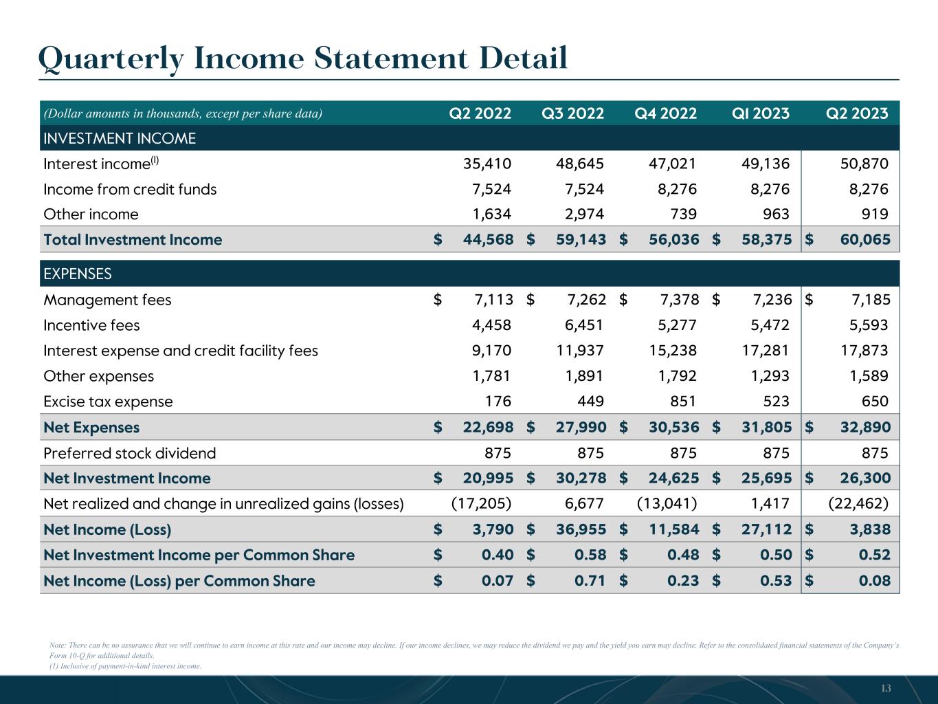 Quarterly Income Statement Detail Note: There can be no assurance that we will continue to earn income at this rate and our income may decline. If our income declines, we may reduce the dividend we pay and the yield you earn may decline. Refer to the consolidated financial statements of the Company’s Form 10-Q for additional details. (1) Inclusive of payment-in-kind interest income. (Dollar amounts in thousands, except per share data) Q2 2022 Q3 2022 Q4 2022 Q1 2023 Q2 2023 INVESTMENT INCOME Interest income(1) 35,410 48,645 47,021 49,136 50,870 Income from credit funds 7,524 7,524 8,276 8,276 8,276 Other income 1,634 2,974 739 963 919 Total Investment Income $ 44,568 $ 59,143 $ 56,036 $ 58,375 $ 60,065 EXPENSES Management fees $ 7,113 $ 7,262 $ 7,378 $ 7,236 $ 7,185 Incentive fees 4,458 6,451 5,277 5,472 5,593 Interest expense and credit facility fees 9,170 11,937 15,238 17,281 17,873 Other expenses 1,781 1,891 1,792 1,293 1,589 Excise tax expense 176 449 851 523 650 Net Expenses $ 22,698 $ 27,990 $ 30,536 $ 31,805 $ 32,890 Preferred stock dividend 875 875 875 875 875 Net Investment Income $ 20,995 $ 30,278 $ 24,625 $ 25,695 $ 26,300 Net realized and change in unrealized gains (losses) (17,205) 6,677 (13,041) 1,417 (22,462) Net Income (Loss) $ 3,790 $ 36,955 $ 11,584 $ 27,112 $ 3,838 Net Investment Income per Common Share $ 0.40 $ 0.58 $ 0.48 $ 0.50 $ 0.52 Net Income (Loss) per Common Share $ 0.07 $ 0.71 $ 0.23 $ 0.53 $ 0.08 13