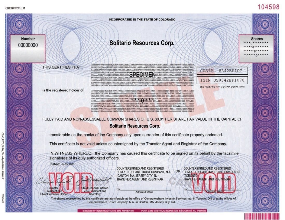 Form of Common Stock Certificate of Solitario Resources Corp. | |