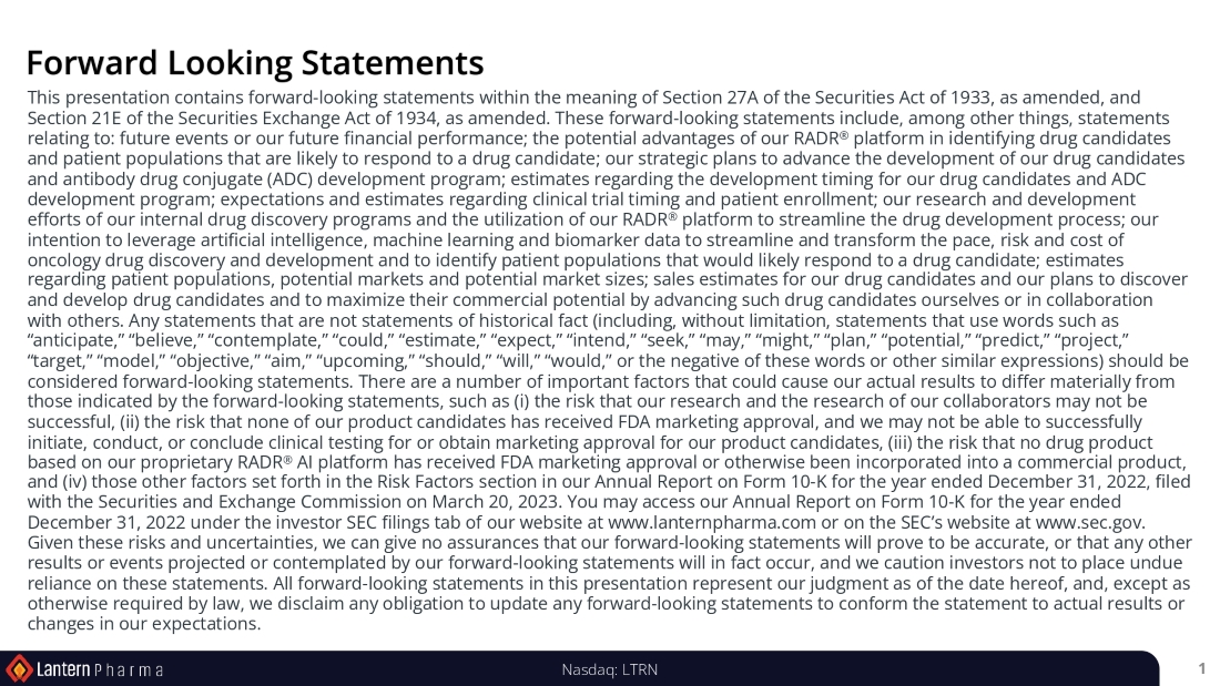 This press release contains forward-looking statements within the meaning of Section 27A of the Securities Act of 1933, as amended, and Section 21E of the Securities Exchange Act of 1934, as amended. These forward-looking statements include, among other things, statements relating to: future events or our future financial performance; the potential advantages of our RADR® platform in identifying drug candidates and patient populations that are likely to respond to a drug candidate; our strategic plans to advance the development of our drug candidates and antibody drug conjugate (ADC) development program; estimates regarding the development timing for our drug candidates and ADC development program; expectations and estimates regarding clinical trial timing and patient enrollment; our research and development efforts of our internal drug discovery programs and the utilization of our RADR® platform to streamline the drug development process; our intention to leverage artificial intelligence, machine learning and biomarker data to streamline and transform the pace, risk and cost of oncology drug discovery and development and to identify patient populations that would likely respond to a drug candidate; estimates regarding patient populations, potential markets and potential market sizes; sales estimates for our drug candidates and our plans to discover and develop drug candidates and to maximize their commercial potential by advancing such drug candidates ourselves or in collaboration with others. Any statements that are not statements of historical fact (including, without limitation, statements that use words such as "anticipate," "believe," "contemplate," "could," "estimate," "expect," "intend," "seek," "may," "might," "plan," "potential," "predict," "project," "target," "model," "objective," "aim," "upcoming," "should," "will," "would," or the negative of these words or other similar expressions) should be considered forward-looking statements. There are a number of important factors that could cause our actual results to differ materially from those indicated by the forward-looking statements, such as (i) the risk that our research and the research of our collaborators may not be successful, (ii) the risk that none of our product candidates has received FDA marketing approval, and we may not be able to successfully initiate, conduct, or conclude clinical testing for or obtain marketing approval for our product candidates, (iii) the risk that no drug product based on our proprietary RADR® AI platform has received FDA marketing approval or otherwise been incorporated into a commercial product, and (iv) those other factors set forth in the Risk Factors section in our Annual Report on Form 10-K for the year ended December 31, 2022, filed with the Securities and Exchange Commission on March 20, 2023. You may access our Annual Report on Form 10-K for the year ended December 31, 2022 under the investor SEC filings tab of our website at www.lanternpharma.com or on the SEC's website at www.sec.gov. Given these risks and uncertainties, we can give no assurances that our forward-looking statements will prove to be accurate, or that any other results or events projected or contemplated by our forward-looking statements will in fact occur, and we caution investors not to place undue reliance on these statements. All forward-looking statements in this press release represent our judgment as of the date hereof, and, except as otherwise required by law, we disclaim any obligation to update any forward-looking statements to conform the statement to actual results or changes in our expectations.