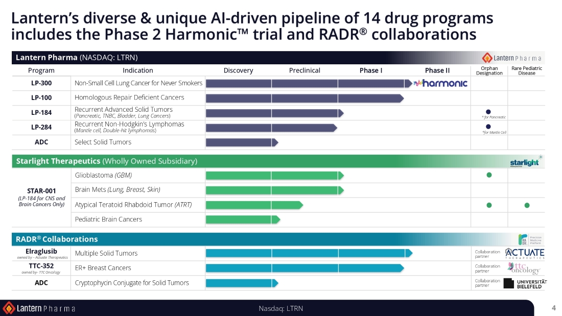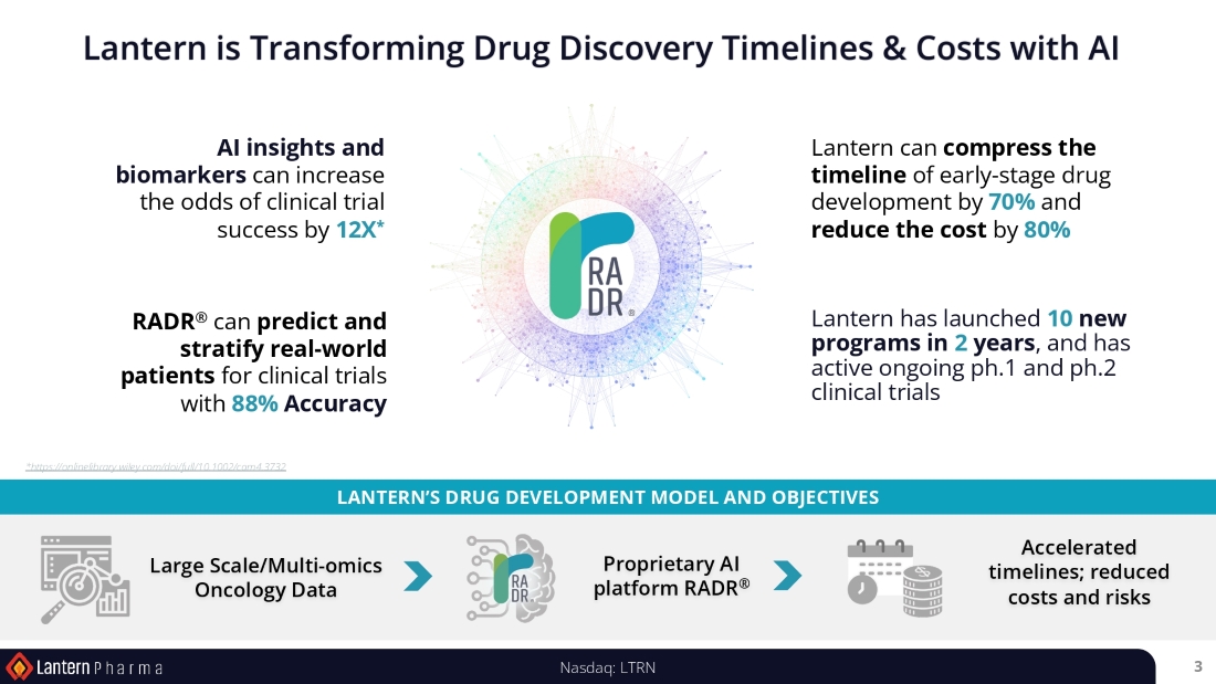 Lantern Pharma (NASDAQ: LTRN) is an AI company transforming the cost, pace, and timeline of oncology drug discovery and development. Our proprietary AI and machine learning (ML) platform, RADR®, leverages over 34 billion oncology-focused data points and a library of 200+ advanced ML algorithms to help solve billion-dollar, real-world problems in oncology drug development. By harnessing the power of AI and with input from world-class scientific advisors and collaborators, we have accelerated the development of our growing pipeline of therapies including eleven cancer indications and an antibody-drug conjugate (ADC) program. On average, our newly developed drug programs have been advanced from initial AI insights to first-in-human clinical trials in 2-3 years and at approximately $1.0-2.0 million per program.