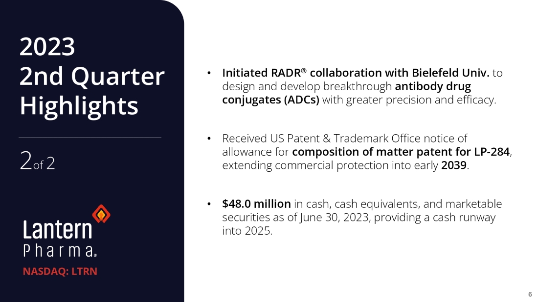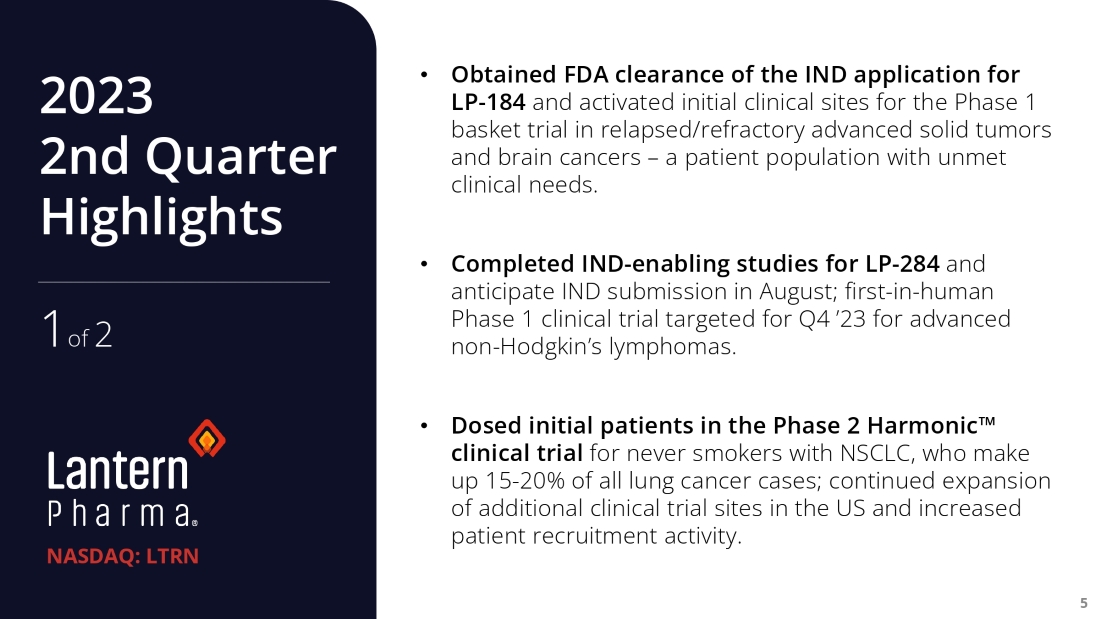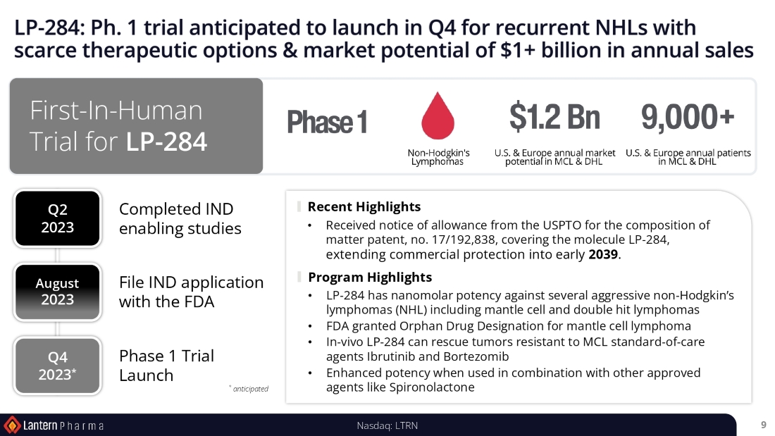 | ● | LP-284 – IND-enabling studies for LP-284 have been completed, and Lantern expects to submit the IND application to the FDA in August. The first-in-human Phase 1 clinical trial launch of LP-284 is targeted for Q4 of 2023 for B-cell non-Hodgkin’s lymphomas (NHL), where LP-284 has shown nanomolar potency across multiple in vitro and in vivo studies, including mantle cell lymphoma (MCL), double hit lymphoma (DHL), and other advanced NHL cancer subtypes with DNA damage response deficiencies, notably those with reduced expression of the ataxia-telangiectasia mutated (ATM) gene due to mutations or deletions. | |