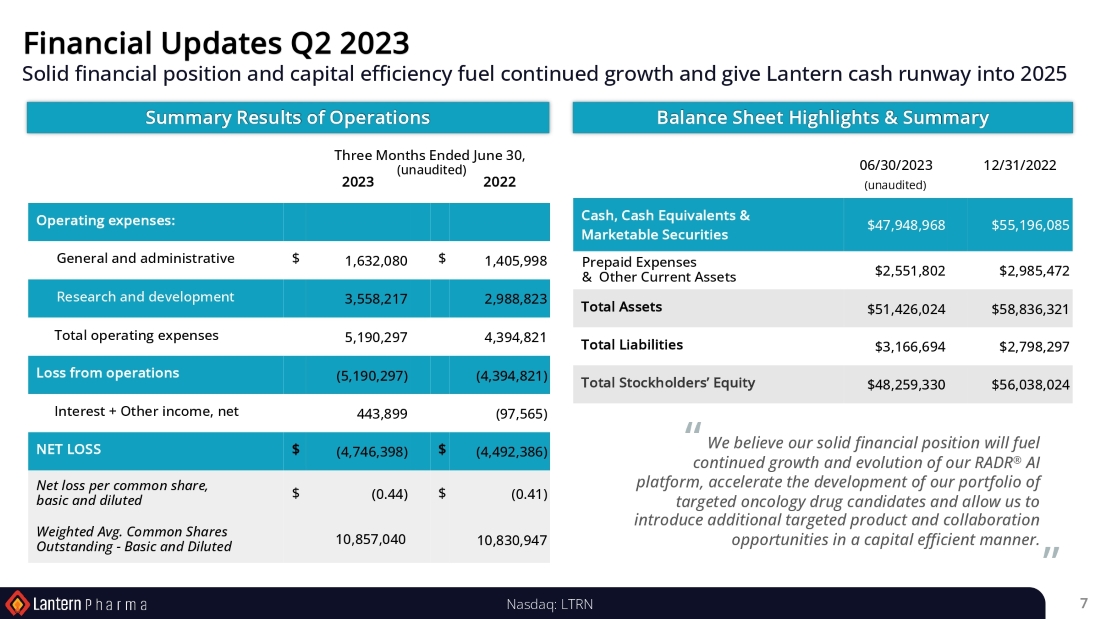 Lantern Pharma Reports Second Quarter 2023 Financial Results and Operational Highlights