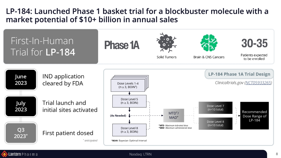 | ● | LP-184 – Received Food and Drug Administration (FDA) clearance of the investigational new drug (IND) application for LP-184 during the second quarter of 2023. LP-184 is the first of Lantern’s drug candidates to be developed entirely internally, with the assistance of Lantern’s AI and ML platform RADR®, to advance to a first-in-human Phase 1 basket trial. Lantern has rapidly accelerated the clinical advancement of LP-184 and has activated the first two Phase 1 clinical trial sites and begun screening patients. Indications for the trial are anticipated to include relapsed/refractory advanced pancreatic cancer, glioblastoma (GBM), brain metastases (brain mets.), and multiple other solid tumor types with DNA damage response deficiencies. | |