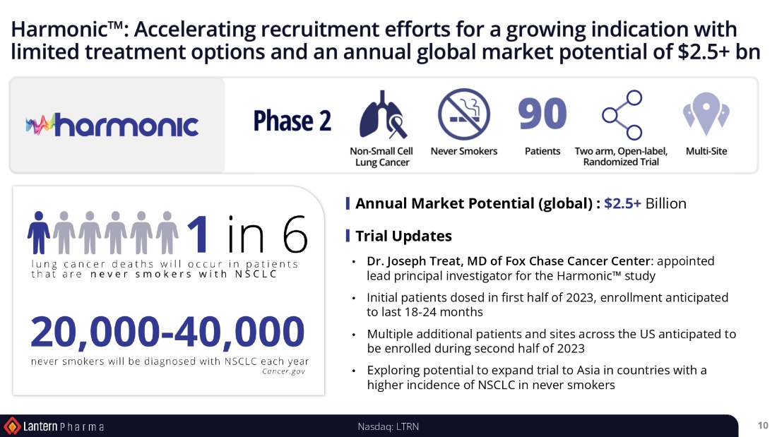| ● | Dosed initial patients in the Phase 2 Harmonic™ clinical trial for never smokers with NSCLC, who make up 15-20% of all lung cancer cases; continued expansion of additional clinical trial sites in the US and increased patient recruitment activity. | |