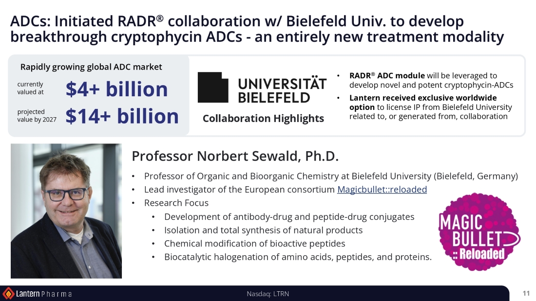| ● | Lantern initiated a new collaboration with Bielefeld University to develop breakthrough ADCs. The collaboration with Bielefeld University's Professor Norbert Sewald, Ph.D., a leading researcher in the field and head of the Magicbullet::reloaded consortium, is focusing on the synthesis and evaluation of novel ADCs linked to cryptophycins, a promising group of potent antitumor molecules. The global ADC market, currently valued at over $4 billion, is projected to reach $14 billion by 2027 and Lantern is positioned to be at the forefront of this rapidly growing sector. |