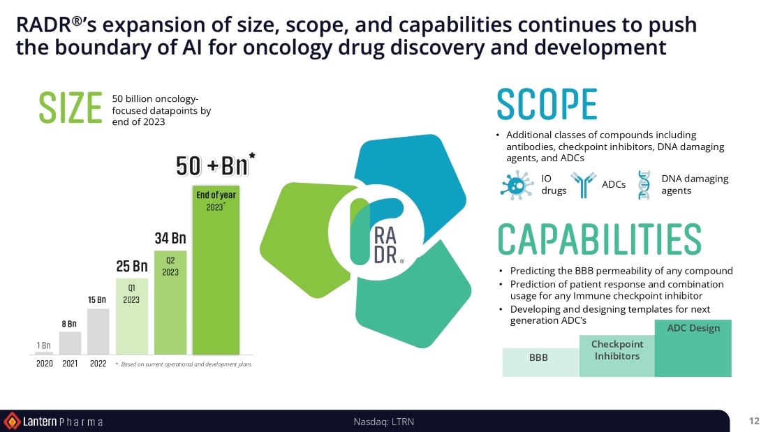 | ● | RADR® continues to advance in size, scope, and capabilities to accelerate the Company’s pipeline of precision therapeutics and also become a standard for AI-driven drug development in oncology. RADR® has now surpassed 34 billion oncology-focused datapoints and is projected to reach 50 billion datapoints by the end of 2023. The scope of RADR®’s data has broadened with a strategic focus on additional classes of compounds including antibodies, checkpoint inhibitors, and DNA damaging agents, and data from additional studies such as those being conducted clinically as a liquid biopsy for cancer diagnosis and treatment or those from preclinical combination studies that aim to define drug interaction and optimal dosage. | |