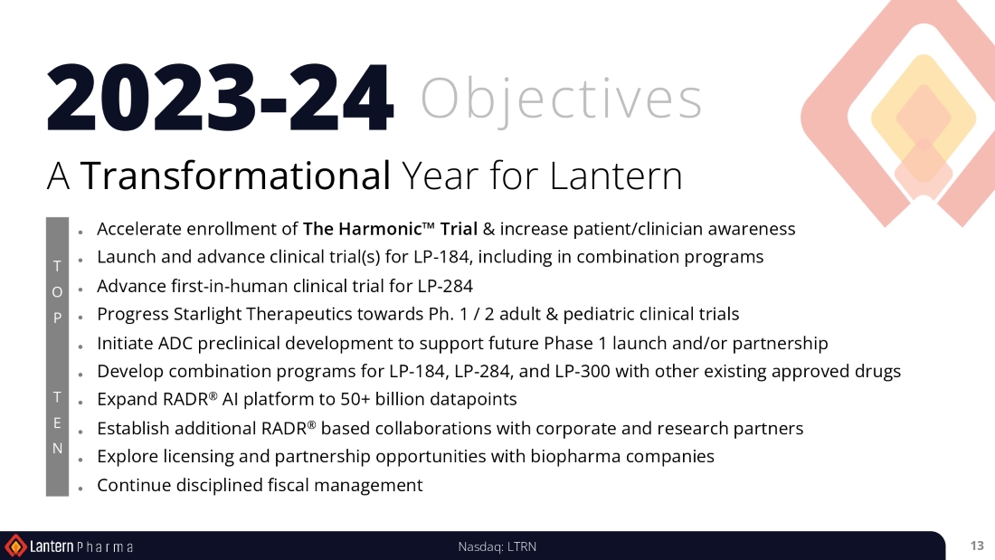 | ● | In Q1 2023, Lantern formed a wholly-owned subsidiary, Starlight Therapeutics Inc. (“Starlight”), for the clinical development of drug candidate LP-184’s central nervous system (CNS) and brain cancer indications – including GBM, brain mets., and several rare pediatric CNS cancers. Starlight will refer to the molecule LP-184, as it is developed in CNS indications, as “STAR-001”. | |