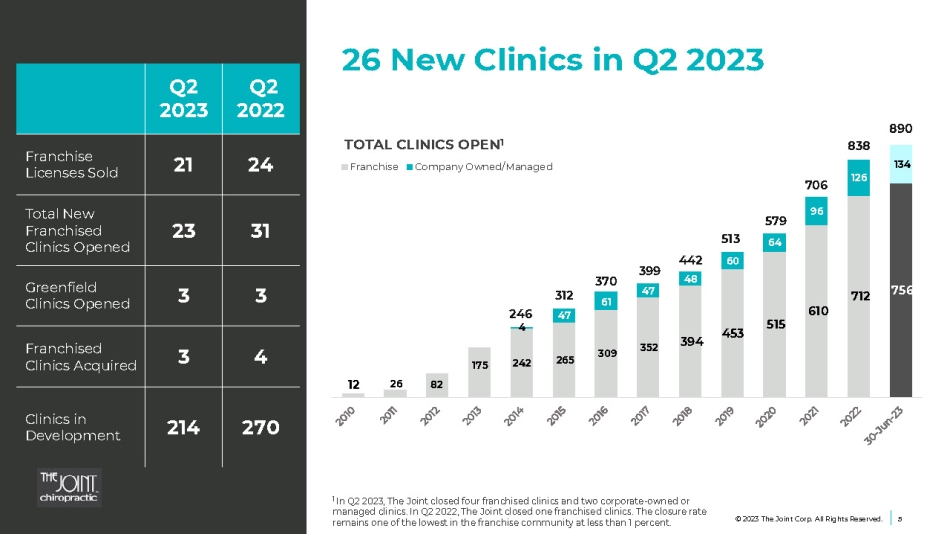 Building upon Foundation for Growth 4 © 2023 The Joint Corp. All Rights Reserved. 13% Increase in system - wide sales Q2 2023 over Q2 2022 1 5% Increase in comp sales 1 for all clinics >13 months in operation Q2 2023 over Q2 2022 2 ( 1 ) % Decrease in comp sales 1 for all clinics >48 months in operation Q2 2023 over Q2 2022 2 1 System - wide sales include revenues at all clinics, whether operated or managed by the company or by franchisees. While franchised sales are not recorded as revenues by the company, management believes the information is important in understanding the company’s financial performance, because these revenues are the basis on which the company calculates and records royalty fees and are indicative of the financial health of the franchisee base. | 2 Comparable sales include only the sales from clinics that have been open at least 13 or 48 full months and exclude any clinics that have permanently closed.