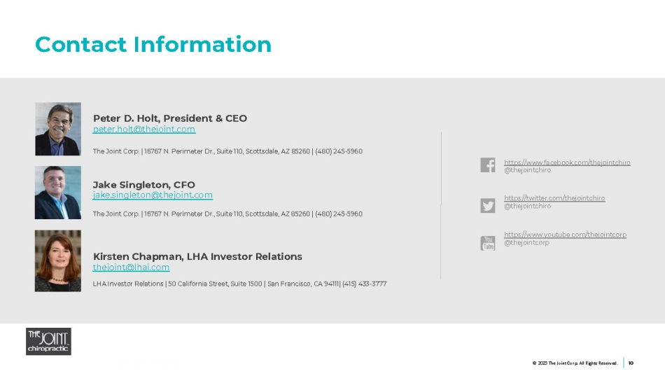 Jake Singleton, CFO jake.singleton@thejoint.com The Joint Corp. | 16767 N. Perimeter Dr., Suite 110, Scottsdale, AZ 85260 | (480) 245 - 5960 https://www.facebook.com/thejointchiro @thejointchiro https://twitter.com/thejointchiro @thejointchiro https://www.youtube.com/thejointcorp @thejointcorp Peter D. Holt, President & CEO peter.holt@thejoint.com The Joint Corp. | 16767 N. Perimeter Dr., Suite 110, Scottsdale, AZ 85260 | (480) 245 - 5960 Kirsten Chapman, LHA Investor Relations thejoint@lhai.com LHA Investor Relations | 50 California Street, Suite 1500 | San Francisco, CA 94111| (415) 433 - 3777 Contact Information 10 © 2023 The Joint Corp. All Rights Reserved.