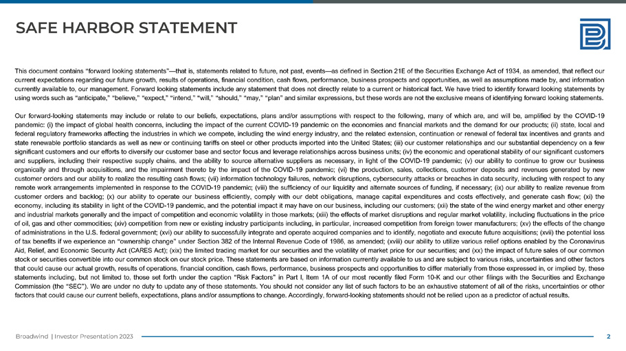 2 Broadwind | Investor Presentation 2023 SAFE HARBOR STATEMENT This document contains “forward looking statements” — that is, statements related to future, not past, events — as defined in Section 21 E of the Securities Exchange Act of 1934 , as amended, that reflect our current expectations regarding our future growth, results of operations, financial condition, cash flows, performance, business prospects and opportunities, as well as assumptions made by, and information currently available to, our management . Forward looking statements include any statement that does not directly relate to a current or historical fact . We have tried to identify forward looking statements by using words such as “anticipate,” “believe,” “expect,” “intend,” “will,” “should,” “may,” “plan” and similar expressions, but these words are not the exclusive means of identifying forward looking statements . Our forward - looking statements may include or relate to our beliefs, expectations, plans and/or assumptions with respect to the following, many of which are, and will be, amplified by the COVID - 19 pandemic : ( i ) the impact of global health concerns, including the impact of the current COVID - 19 pandemic on the economies and financial markets and the demand for our products ; (ii) state, local and federal regulatory frameworks affecting the industries in which we compete, including the wind energy industry, and the related extension, continuation or renewal of federal tax incentives and grants and state renewable portfolio standards as well as new or continuing tariffs on steel or other products imported into the United States ; (iii) our customer relationships and our substantial dependency on a few significant customers and our efforts to diversify our customer base and sector focus and leverage relationships across business units ; (iv) the economic and operational stability of our significant customers and suppliers, including their respective supply chains, and the ability to source alternative suppliers as necessary, in light of the COVID - 19 pandemic ; (v) our ability to continue to grow our business organically and through acquisitions, and the impairment thereto by the impact of the COVID - 19 pandemic ; (vi) the production, sales, collections, customer deposits and revenues generated by new customer orders and our ability to realize the resulting cash flows ; (vii) information technology failures, network disruptions, cybersecurity attacks or breaches in data security, including with respect to any remote work arrangements implemented in response to the COVID - 19 pandemic ; (viii) the sufficiency of our liquidity and alternate sources of funding, if necessary ; (ix) our ability to realize revenue from customer orders and backlog ; (x) our ability to operate our business efficiently, comply with our debt obligations, manage capital expenditures and costs effectively, and generate cash flow ; (xi) the economy, including its stability in light of the COVID - 19 pandemic, and the potential impact it may have on our business, including our customers ; (xii) the state of the wind energy market and other energy and industrial markets generally and the impact of competition and economic volatility in those markets ; (xiii) the effects of market disruptions and regular market volatility, including fluctuations in the price of oil, gas and other commodities ; (xiv) competition from new or existing industry participants including, in particular, increased competition from foreign tower manufacturers ; (xv) the effects of the change of administrations in the U . S . federal government ; (xvi) our ability to successfully integrate and operate acquired companies and to identify, negotiate and execute future acquisitions ; (xvii) the potential loss of tax benefits if we experience an “ownership change” under Section 382 of the Internal Revenue Code of 1986 , as amended ; (xviii) our ability to utilize various relief options enabled by the Coronavirus Aid, Relief, and Economic Security Act (CARES Act) ; (xix) the limited trading market for our securities and the volatility of market price for our securities ; and (xx) the impact of future sales of our common stock or securities convertible into our common stock on our stock price . These statements are based on information currently available to us and are subject to various risks, uncertainties and other factors that could cause our actual growth, results of operations, financial condition, cash flows, performance, business prospects and opportunities to differ materially from those expressed in, or implied by, these statements including, but not limited to, those set forth under the caption “Risk Factors” in Part I, Item 1 A of our most recently filed Form 10 - K and our other filings with the Securities and Exchange Commission (the “SEC”) . We are under no duty to update any of these statements . You should not consider any list of such factors to be an exhaustive statement of all of the risks, uncertainties or other factors that could cause our current beliefs, expectations, plans and/or assumptions to change . Accordingly, forward - looking statements should not be relied upon as a predictor of actual results .