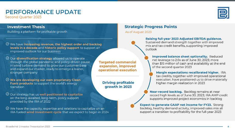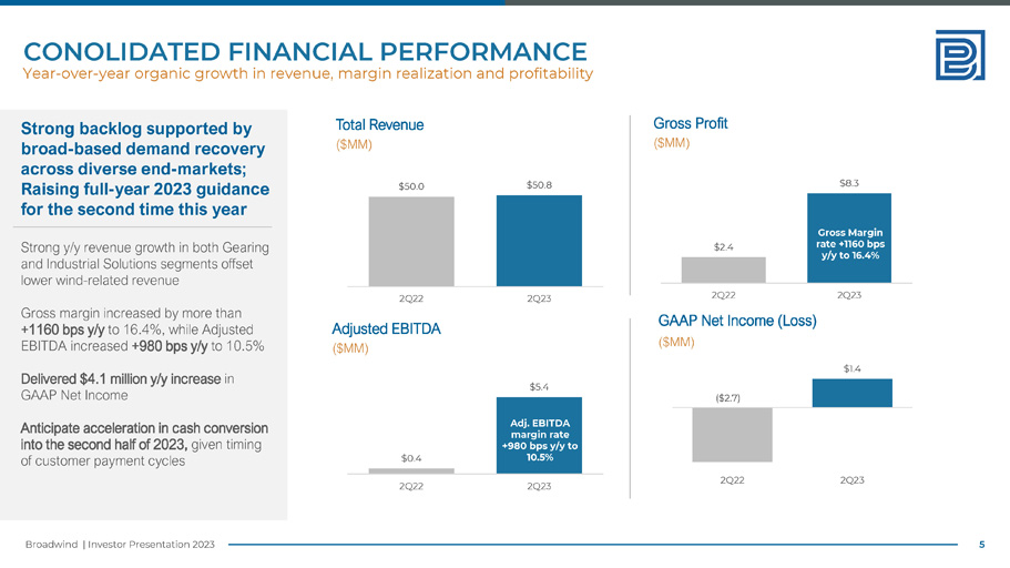 4 Broadwind | Investor Presentation 2023 PERFORMANCE UPDATE Targeted commercial expansion, improved operational execution Driving profitable growth in 2023 Strategic Progress Points As of August 2023 Raising full - year 2023 Adjusted EBITDA guidance. Sustained demand strength together with improved mix and tax credit benefits, supporting improved outlook Improved balance sheet optionality. Reduced net leverage to 2.0x as of June 30, 2023; more than $15 million of cash and availability at the end of the second quarter 2023 Margin expectations recalibrated higher . IRA tax credits, together with improved operational execution, have positioned us to drive materially higher margin realization in 2023 Near - record backlog. Backlog remains at near record high levels as of June 30, 2023; IRA AMP credit supports improved project economics in backlog Expect to generate GAAP net income for FY23. Strong backlog, healthy demand activity, improved sales mix all support a transition to profitability for the full - year 2023 We have increasing revenue, the highest order and backlog levels in a decade and historic policy support to support an improved outlook for our business Our diversification strategy allowed us to operate through the global pandemic and policy - driven pause in wind turbine demand to grow our customer base and expand our market, ready to emerge a leaner, stronger company We are developing our own proprietary Clean Fuels products to support the world’s energy transition Our strategy has us well positioned to capitalize on the long - awaited, long - term, policy support provided by the IRA of 2022 We have the capacity, expertise and relations to capitalize on an IRA - fueled wind investment cycle that we expect to begin in 2024 Investment Thesis Building a platform for profitable growth Second Quarter 2023