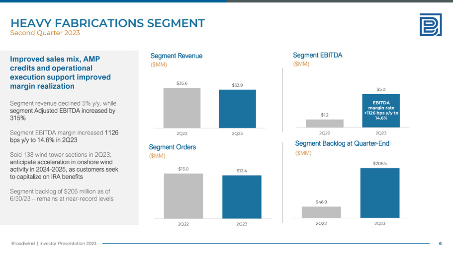 5 Broadwind | Investor Presentation 2023 Year - over - year organic growth in revenue, margin realization and profitability CONOLIDATED FINANCIAL PERFORMANCE Total Revenue ($MM) Gross Profit ($MM) Adjusted EBITDA ($MM) GAAP Net Income (Loss) ($MM) $50.0 $50.8 2Q22 2Q23 $2.4 $8.3 2Q22 2Q23 $0.4 $5.4 2Q22 2Q23 ($2.7) $1.4 2Q22 2Q23 Gross Margin rate +1160 bps y/y to 16.4% Adj. EBITDA margin rate +980 bps y/y to 10.5% Strong backlog supported by broad - based demand recovery across diverse end - markets; R aising full - year 2023 guidance for the second time this year Strong y/y revenue growth in both Gearing and Industrial Solutions segments offset lower wind - related revenue Gross margin increased by more than +1160 bps y/y to 16.4%, while Adjusted EBITDA increased +980 bps y/y to 10.5% Delivered $4.1 million y/y increase in GAAP Net Income Anticipate acceleration in cash conversion into the second half of 2023, given timing of customer payment cycles