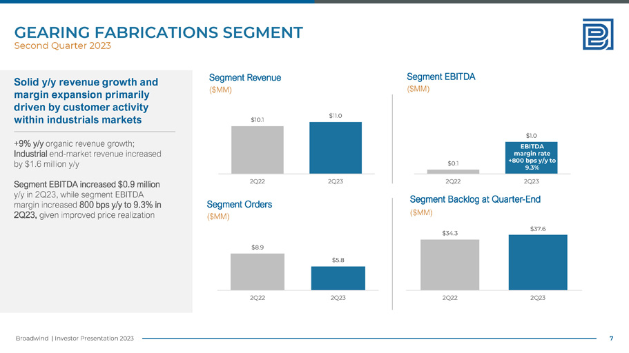 6 Broadwind | Investor Presentation 2023 Second Quarter 2023 HEAVY FABRICATIONS SEGMENT Improved sales mix, AMP credits and operational execution support improved margin realization Segment revenue declined 5% y/y, while segment Adjusted EBITDA increased by 315% Segment EBITDA margin increased 1126 bps y/y to 14.6% in 2Q23 Sold 138 wind tower sections in 2Q23; anticipate acceleration in onshore wind activity in 2024 - 2025, as customers seek to capitalize on IRA benefits Segment backlog of $206 million as of 6/30/23 – remains at near - record levels Segment Revenue ($MM) Segment EBITDA ($MM) Segment Orders ($MM) Segment Backlog at Quarter - End ($MM) $35.6 $33.9 2Q22 2Q23 $1.2 $5.0 2Q22 2Q23 EBITDA margin rate +1126 bps y/y to 14.6% $13.0 $12.4 2Q22 2Q23 $46.9 $206.5 2Q22 2Q23