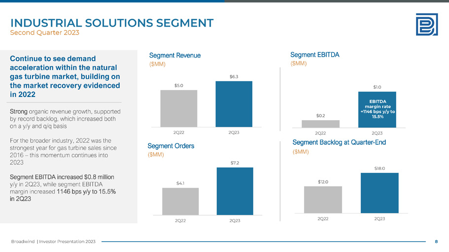 7 Broadwind | Investor Presentation 2023 Second Quarter 2023 GEARING FABRICATIONS SEGMENT Solid y/y revenue growth and margin expansion primarily driven by customer activity within industrials markets +9% y/y organic revenue growth; Industrial end - market revenue increased by $1.6 million y/y Segment EBITDA increased $0.9 million y/y in 2Q23, while segment EBITDA margin increased 800 bps y/y to 9.3% in 2Q23, given improved price realization Segment Revenue ($MM) Segment EBITDA ($MM) Segment Orders ($MM) Segment Backlog at Quarter - End ($MM) $10.1 $11.0 2Q22 2Q23 $0.1 $1.0 2Q22 2Q23 EBITDA margin rate +800 bps y/y to 9.3% $8.9 $5.8 2Q22 2Q23 $34.3 $37.6 2Q22 2Q23