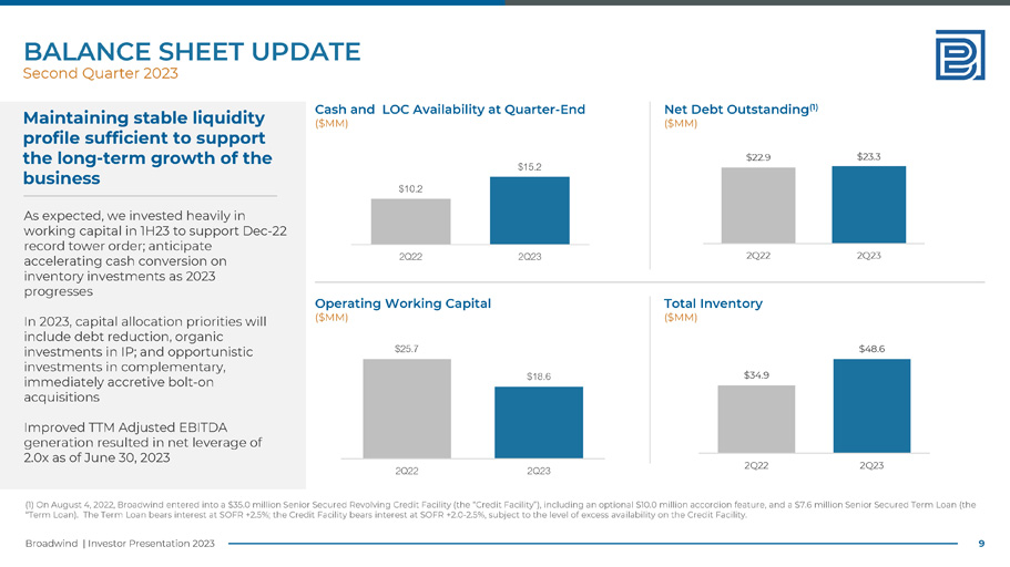As of June 30, 2023, Broadwind had total cash on hand and availability under its credit facility of $15.2 million, as compared to $10.2 million at the end of the second quarter 2022.