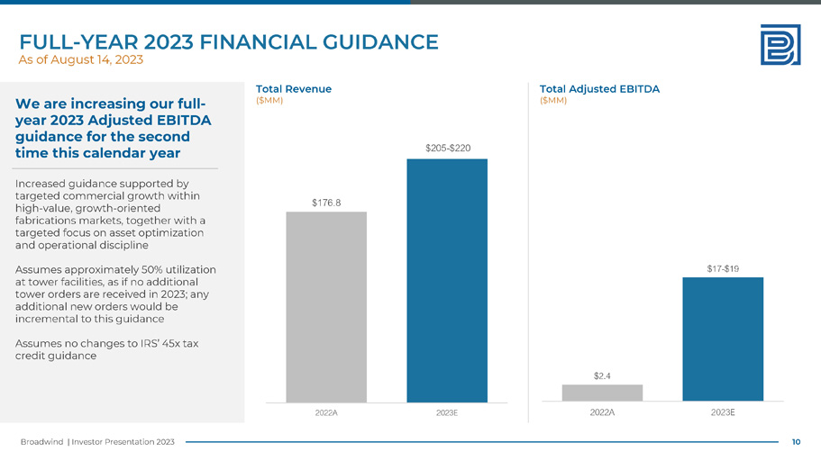 9 Broadwind | Investor Presentation 2023 (1) On August 4, 2022, Broadwind entered into a $35.0 million Senior Secured Revolving Credit Facility (the “Credit Facility”), including an optional $10.0 mi ll ion accordion feature, and a $7.6 million Senior Secured Term Loan (the “Term Loan). The Term Loan bears interest at SOFR +2.5%; the Credit Facility bears interest at SOFR +2.0 - 2.5%, subject to the l evel of excess availability on the Credit Facility. Maintaining stable liquidity profile sufficient to support the long - term growth of the business As expected, we invested heavily in working capital in 1H23 to support Dec - 22 record tower order; anticipate accelerating cash conversion on inventory investments as 2023 progresses In 2023, capital allocation priorities will include debt reduction, organic investments in IP; and opportunistic investments in complementary, immediately accretive bolt - on acquisitions Improved TTM Adjusted EBITDA generation resulted in net leverage of 2.0x as of June 30, 2023 Cash and LOC Availability at Quarter - End ($MM) Net Debt Outstanding (1) ($MM) Operating Working Capital ($MM) Total Inventory ($MM) Second Quarter 2023 BALANCE SHEET UPDATE $10.2 $15.2 2Q22 2Q23 $22.9 $23.3 2Q22 2Q23 $25.7 $18.6 2Q22 2Q23 $34.9 $48.6 2Q22 2Q23