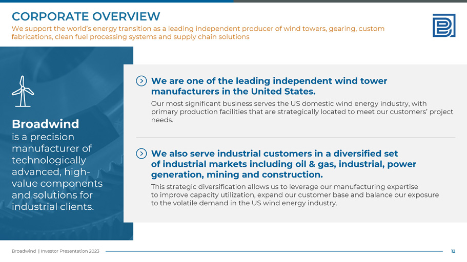 12 Broadwind | Investor Presentation 2023 CORPORATE OVERVIEW We support the world’s energy transition as a leading independent producer of wind towers, gearing, custom fabrications, clean fuel processing systems and supply chain solutions Broadwind is a precision manufacturer of technologically advanced, high - value components and solutions for industrial clients. We are one of the leading independent wind tower manufacturers in the United States. Our most significant business serves the US domestic wind energy industry, with primary production facilities that are strategically located to meet our customers’ project needs. We also serve industrial customers in a diversified set of industrial markets including oil & gas, industrial, power generation, mining and construction. This strategic diversification allows us to leverage our manufacturing expertise to improve capacity utilization, expand our customer base and balance our exposure to the volatile demand in the US wind energy industry.