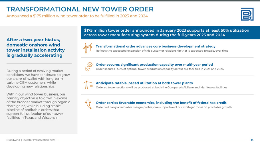 13 Broadwind | Investor Presentation 2023 What we do Precision manufacturing within wind sector and other diverse end - markets We provide large complex and precision fabrications to customers in a broad range of industrial markets, as well as proprietary clean fuel processing systems. Key products include wind towers, PRS units and industrial fabrications, which include components for mining, construction, marine, material handling and other applications Heavy Fabrications Segment 66% of 2022 Revenue We provide custom gearing, gearboxes and heat treat services to a broad set of customers in diverse markets, including oil and gas production, surface and underground mining, wind energy, steel, material handling and other infrastructure markets Gearing Segment 24% of 2022 Revenue We provide supply chain solutions, inventory management, kitting and assembly services, primarily serving the combined cycle natural gas turbine and solar power generation markets Industrial Solutions Segment 10% of 2022 Revenue Why we win Unique Value Proposition Proven engineering, product development and technical capabilities Expertise in manufacturing large, complex fabrications, gearing, and proprietary clean fuel processing systems Integrated design, sourcing, fabrication, machining, coating, assembly Stringent testing and quality capabilities Targeted, multi - industry focus Our manufacturing base Established Original Equipment Manufacturer (“OEM”) Relationships Our customer base Established OEM Relationships Manitowoc, WI Tower Manufacturing Industrial Fabrications Facility Abilene, TX Tower Manufacturing Industrial Fabrications Facility Cicero, IL Gear Manufacturing and Gearbox Repair Facility Pittsburgh, PA Gearbox Repair and Heat Treat Facility Sanford, NC Industrial Solutions and Gearbox Repair Facility OUR BUSINESS Building a platform sustained, profitable growth and long - term value creation