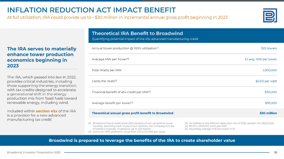 14 Broadwind | Investor Presentation 2023 TRANSFORMATIONAL NEW TOWER ORDER Announced a $175 million wind tower order to be fulfilled in 2023 and 2024 After a two - year hiatus, domestic onshore wind tower installation activity is gradually accelerating During a period of evolving market conditions, we have continued to grow our share - of - wallet with long - term turbine OEM customers, while developing new relationships Within our wind tower business, our primary objective is to grow in excess of the broader market through organic share gains, while building stable pipeline of profitable orders that support full utilization of our tower facilities in Texas and Wisconsin $175 million tower order announced in January 2023 supports at least 50% utilization across tower manufacturing system during the full - years 2023 and 2024 Transformational order advances core business development strategy Reflects the successful expansion of this customer relationship that is expected to scale, over time Order secures significant production capacity over multi - year period Order secures ~50% of optimal tower production capacity across our facilities in 2023 and 2024 Anticipate ratable, paced utilization at both tower plants Ordered tower sections will be produced at both the Company’s Abilene and Manitowoc facilities Order carries favorable economics, including the benefit of federal tax credit Order will carry a favorable margin profile, one supportive of our strategic focus on profitable growth