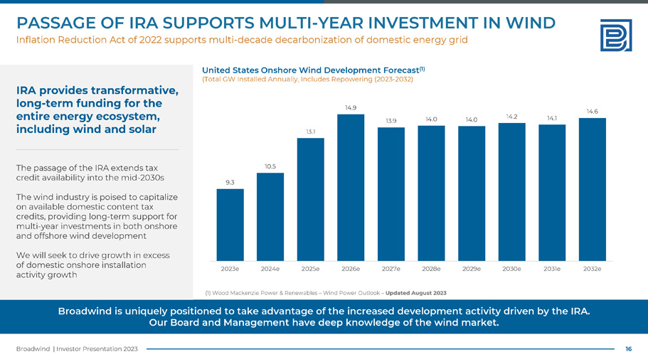 15 Broadwind | Investor Presentation 2023 INFLATION REDUCTION ACT IMPACT BENEFIT At full utilization, IRA could provide up to ~$30 million in incremental annual gross profit beginning in 2023 Broadwind is prepared to leverage the benefits of the IRA to create shareholder value The IRA serves to materially enhance tower production economics beginning in 2023 The IRA, which passed into law in 2022, provides critical industries, including those supporting the energy transition, with tax credits designed to accelerate a generational shift in the energy production mix from fossil fuels toward renewable energy, including wind. Included within section 45x of the IRA is a provision for a new advanced manufacturing tax credit Theoretical IRA Benefit to Broadwind Quantifying potential impact of the 45x advanced manufacturing credit Theoretical annual gross profit benefit to Broadwind $30 million Annual tower production @ 100% utilization (1) 325 towers Average MW per Tower (2) 3.1 avg. MW per tower Total Watts per MW 1,000,000 Cents Per Watt (3) $0.03 per watt Financial benefit of 45x credit per MW (4) $30,000 Average benefit per tower (5) $93,000 (1) Broadwind has an estimated 1,300 sections of annual optimal tower capacity; assuming each tower is four sections, the Company has the theoretical capacity to produce up to 325 towers (2) Common OEM platforms range from 2.8 to 3.4 MW per tower (3) As defined in the Inflation Reduction Act of 2022, section 45x (B)(2)(A)(0) (4) $0.03 x 1,000,000 watts per MW (5) Assuming average MW per tower of 3.1