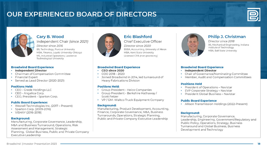 17 Broadwind | Investor Presentation 2023 OUR EXPERIENCED, PROVEN MANAGEMENT TEAM Leadership Team with extensive experience in clean tech manufacturing Eric Blashford Chief Executive Officer Since 2020 Recent Experience • Interim CFO 2021 – Aug. 2022 • COO 2018 - 2020 • President, Broadwind Towers 2014 - 2019 Tom Ciccone Chief Financial Officer Since Aug. 2022 Recent Experience • Principal Accounting Officer 2021 - Aug. 2022 • Corporate Controller, Assistant Treasurer, Assistant Secretary since 2017 Hayes Kennedy Chief Human Resource Officer Since 2020 Recent Experience • Vice President of Human Resources, CHS (NASDAQ: CHSCP, CHSCO, CHSCN, CHSCM, CHSCL) • Senior HR roles at The Gavilon Group LLC and ConAgra Foods Daniel Schueller President, Heavy Fabrications Since 2019 Recent Experience • President, Brad Foote Gear Works (2010 - 2013, 2016 - 2019) • Manufacturing leadership experience at Bronto Skylift and Vactor Manufacturing Gil Mayo President, Industrial Solutions Since 2017 Recent Experience • General Manager, Broadwind Heavy Fabrications (2015 - 2017) • Previous manufacturing leadership experience at Scott Fetzer Company