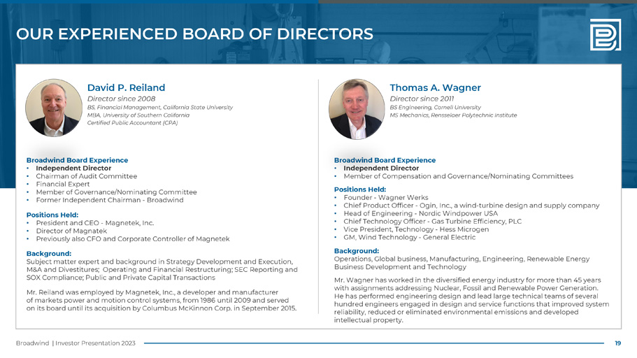 18 Broadwind | Investor Presentation 2023 OUR EXPERIENCED BOARD OF DIRECTORS Leadership Team with extensive experience in clean tech manufacturing Broadwind Board Experience • Independent Director • Chairman of Compensation Committee • Financial Expert • Served as Lead Director (2020 - 2021) Positions Held: • CEO - Grede Holdings LLC • CEO - Angelica Corp. • CEO, President - Sparton Corp. Public Board Experience: • Westell Technologies Inc. (2017 – Present) • Sparton Corp. (2009 - 2016) • VISHAY (2016 - 2018) Background: Manufacturing, Corporate Governance, Leadership, M&A and Business Turnaround, Operations, Risk Assessment and Management, Strategic Planning, Global Business, Public and Private Company Executive Leadership Eric Blashford Chief Executive Officer Director since 2020 BSBA, Accounting, University of Akron MBA, Kent State University Licensed CPA (non - practicing) Broadwind Board Experience • CEO since 2020 • COO 2018 - 2020 • Joined Broadwind in 2014, led turnaround of Heavy Fabrications Division Positions Held: • Group President - Heico Companies • Group President - Berkshire Hathaway / Scott Fetzer • VP / GM - Waltco Truck Equipment Company Background: Manufacturing, Product Development, Accounting, Finance, Corporate Governance, M&A, Business Turnarounds, Operations, Strategic Planning, Public and Private Company Executive Leadership Broadwind Board Experience • Independent Director • Chair of Governance/Nominating Committee • Member, Audit and Compensation Committees Positions Held • President of Operations – Navistar • EVP Corporate Strategy – Navistar • President Global Business – Navistar Public Board Experience • Allison Transmission Holdings (2022 - Present) Background: Manufacturing, Corporate Governance, Leadership, Engineering, Government/Regulatory and Public Policy, Operations, Strategy, Business Turnaround and Global Business, Business Development and Technology Philip J. Christman Director since 2018 BS, Mechanical Engineering, Indiana Institute of Technology MBA, Ball State University Cary B. Wood Independent Chair (since 2021) Director since 2016 BS, Technology, Purdue University MBA, Finance, Loyola University - Chicago MS, Industrial Operations, Lawrence Technological University