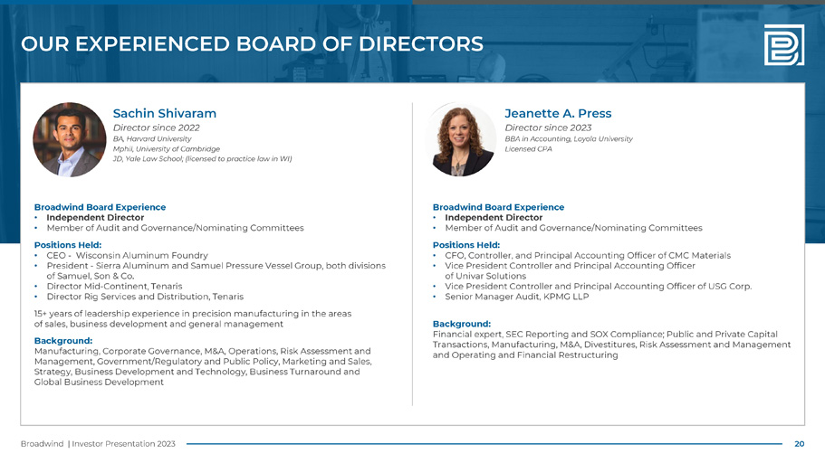 19 Broadwind | Investor Presentation 2023 OUR EXPERIENCED BOARD OF DIRECTORS David P. Reiland Director since 2008 BS, Financial Management, California State University MBA, University of Southern California Certified Public Accountant (CPA) Broadwind Board Experience • Independent Director • Chairman of Audit Committee • Financial Expert • Member of Governance/Nominating Committee • Former Independent Chairman - Broadwind Positions Held: • President and CEO - Magnetek, Inc. • Director of Magnatek • Previously also CFO and Corporate Controller of Magnetek Background: Subject matter expert and background in Strategy Development and Execution, M&A and Divestitures; Operating and Financial Restructuring; SEC Reporting and SOX Compliance; Public and Private Capital Transactions Thomas A. Wagner Director since 2011 BS Engineering, Cornell University MS Mechanics, Rensselaer Polytechnic Institute Broadwind Board Experience • Independent Director • Member of Compensation and Governance/Nominating Committees Positions Held: • Founder - Wagner Werks • Chief Product Officer - Ogin , Inc., a wind - turbine design and supply company • Head of Engineering - Nordic Windpower USA • Chief Technology Officer - Gas Turbine Efficiency, PLC • Vice President, Technology - Hess Microgen • GM, Wind Technology - General Electric Background: Operations, Global business, Manufacturing, Engineering, Renewable Energy Business Development and Technology Mr. Reiland was employed by Magnetek, Inc., a developer and manufacturer of markets power and motion control systems, from 1986 until 2009 and served on its board until its acquisition by Columbus McKinnon Corp. in September 2015. Mr. Wagner has worked in the diversified energy industry for more than 45 years with assignments addressing Nuclear, Fossil and Renewable Power Generation. He has performed engineering design and lead large technical teams of several hundred engineers engaged in design and service functions that improved system reliability, reduced or eliminated environmental emissions and developed intellectual property.