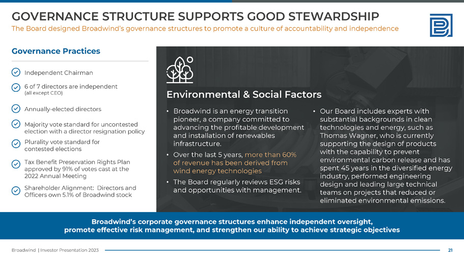 20 Broadwind | Investor Presentation 2023 OUR EXPERIENCED BOARD OF DIRECTORS Sachin Shivaram Director since 2022 BA, Harvard University Mphil , University of Cambridge JD, Yale Law School; (licensed to practice law in WI) Broadwind Board Experience • Independent Director • Member of Audit and Governance/Nominating Committees Positions Held: • CEO - Wisconsin Aluminum Foundry • President - Sierra Aluminum and Samuel Pressure Vessel Group, both divisions of Samuel, Son & Co. • Director Mid - Continent, Tenaris • Director Rig Services and Distribution, Tenaris Background: Manufacturing, Corporate Governance, M&A, Operations, Risk Assessment and Management, Government/Regulatory and Public Policy, Marketing and Sales, Strategy, Business Development and Technology, Business Turnaround and Global Business Development Jeanette A. Press Director since 2023 BBA in Accounting, Loyola University Licensed CPA Broadwind Board Experience • Independent Director • Member of Audit and Governance/Nominating Committees Positions Held: • CFO, Controller, and Principal Accounting Officer of CMC Materials • Vice President Controller and Principal Accounting Officer of Univar Solutions • Vice President Controller and Principal Accounting Officer of USG Corp. • Senior Manager Audit, KPMG LLP Background: Financial expert, SEC Reporting and SOX Compliance; Public and Private Capital Transactions, Manufacturing, M&A, Divestitures, Risk Assessment and Management and Operating and Financial Restructuring 15+ years of leadership experience in precision manufacturing in the areas of sales, business development and general management