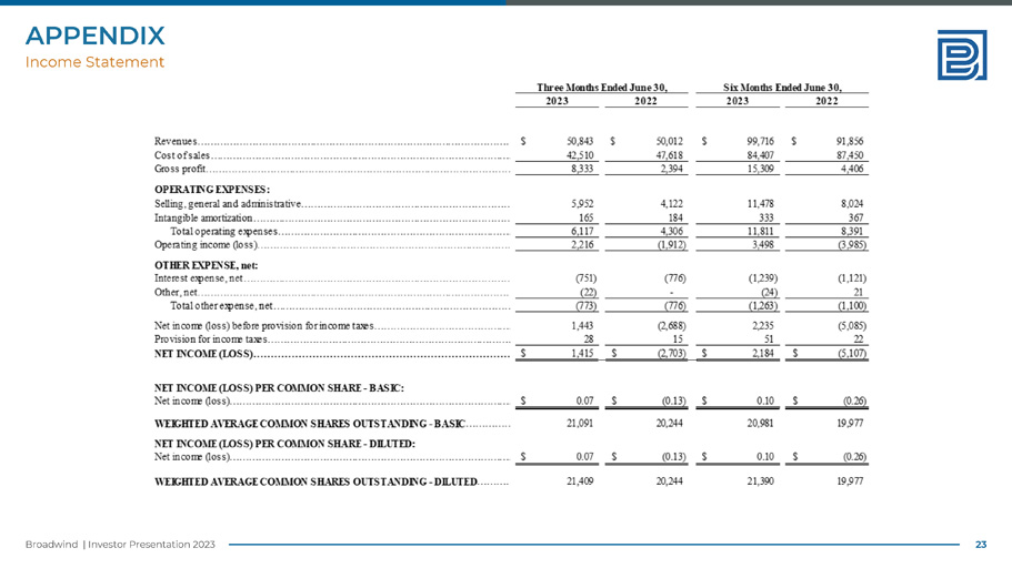 22 Broadwind | Investor Presentation 2023 APPENDIX Balance Sheet