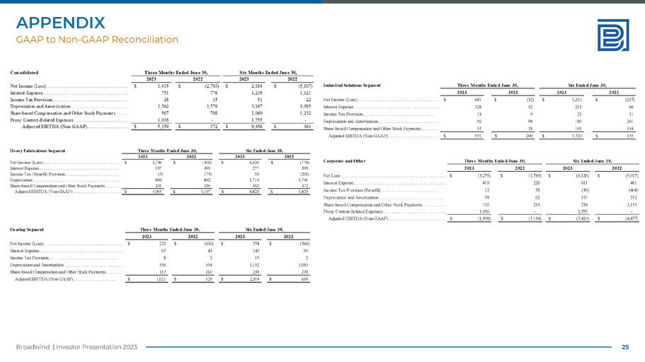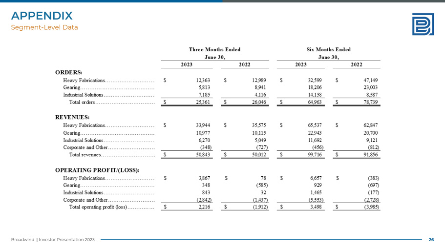 25 Broadwind | Investor Presentation 2023 APPENDIX GAAP to Non - GAAP Reconciliation Heavy Fabrications Segment 2023 2022 2023 2022 Net Income (Loss)……………………...…………………………….……. 3,736$ (302)$ 6,326$ (778)$ Interest Expense……………………………..……………………. 137 455 277 595 Income Tax (Benefit) Provision……..…………………...…………………… (5) (74) 54 (201) Depreciation……………………………………………………………… 856 862 1,714 1,741 Share-based Compensation and Other Stock Payments………………………………………………………………241 256 452 472 Adjusted EBITDA (Non-GAAP)…………………………….. 4,965$ 1,197$ 8,823$ 1,829$ Three Months Ended June 30, Six Ended June 30, Gearing Segment 2023 2022 2023 2022 Net Income (Loss)……………………...……………………...……………. 273$ (630)$ 774$ (766)$ Interest Expense………………………...……………………………… 67 43 140 90 Income Tax Provision…………………...…………………… 8 2 15 2 Depreciation and Amortization………………………………………………………………556 554 1,152 1,030 Share-based Compensation and Other Stock Payments………………………………………………………………117 160 233 278 Adjusted EBITDA (Non-GAAP)……………………….. 1,021$ 129$ 2,314$ 634$ Three Months Ended June 30, Six Ended June 30, Industrial Solutions Segment 2023 2022 2023 2022 Net Income (Loss)……………………...……...……………………………. 681$ (32)$ 1,210$ (257)$ Interest Expense……………………………………………………. 128 52 211 66 Income Tax Provision…………………...…………………… 13 9 21 11 Depreciation and Amortization……………………………………. 92 98 186 201 Share-based Compensation and Other Stock Payments………… 57 73 101 134 Adjusted EBITDA (Non-GAAP)……………………………… 971$ 200$ 1,729$ 155$ Three Months Ended June 30, Six Ended June 30, Corporate and Other 2023 2022 2023 2022 Net Loss………………………..……...……………………………. (3,275)$ (1,739)$ (6,126)$ (5,917)$ Interest Expense……………….…………………………………… 419 226 611 481 Income Tax Provision (Benefit)…………………..…………… 12 78 (39) (408) Depreciation and Amortization………………………………………………………………58 62 115 212 Share-based Compensation and Other Stock Payments………………………………………………………………152 219 274 1,155 Proxy Contest-Related Expenses…………………………………...…………………….1,036 - 1,755 - Adjusted EBITDA (Non-GAAP)……………………..……………. (1,598)$ (1,154)$ (3,410)$ (4,477)$ Three Months Ended June 30, Six Ended June 30,