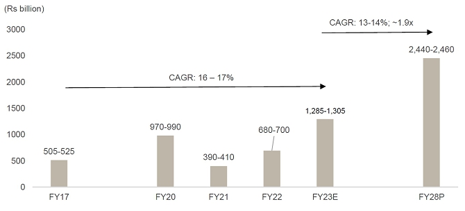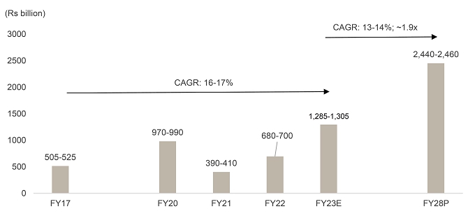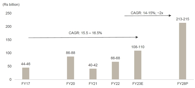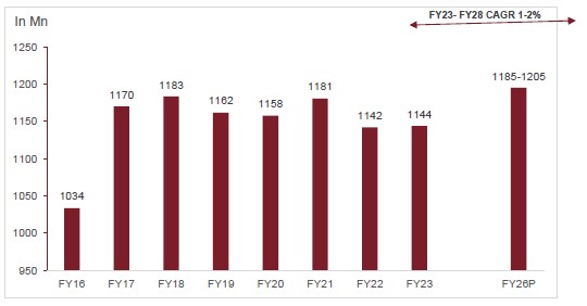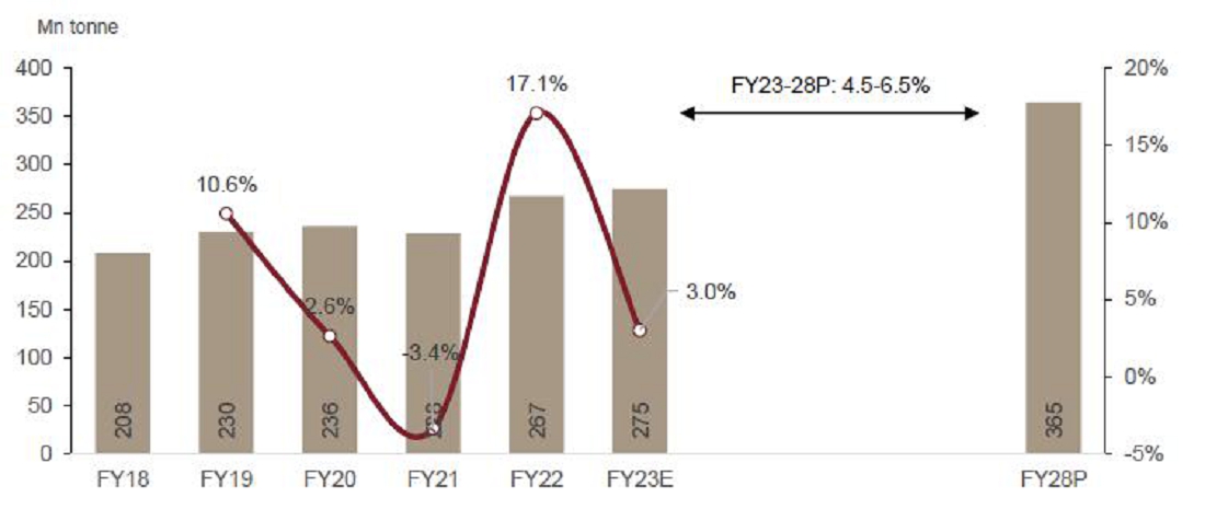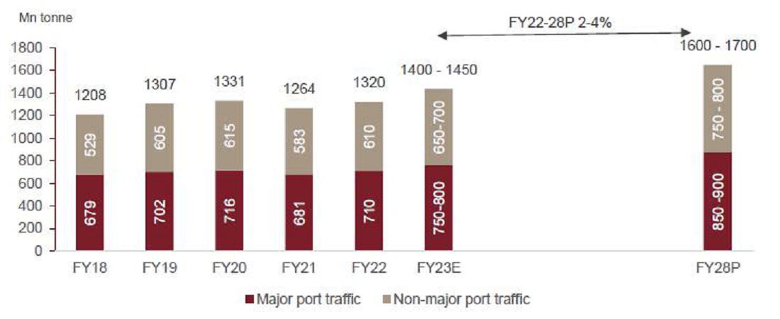 Over fiscals 2023-2028, growth at Indian ports is expected to be at 2-4%. However, tapering growth in Coal and POL (Petroleum Oil and Lubricants) segment, led by slower consumption in crude oil and import substitution of coal along with plateauing of iron ore exports is expected to moderate cargo traffic over long term.