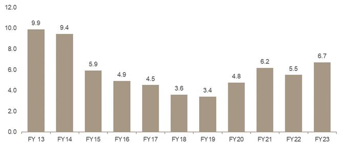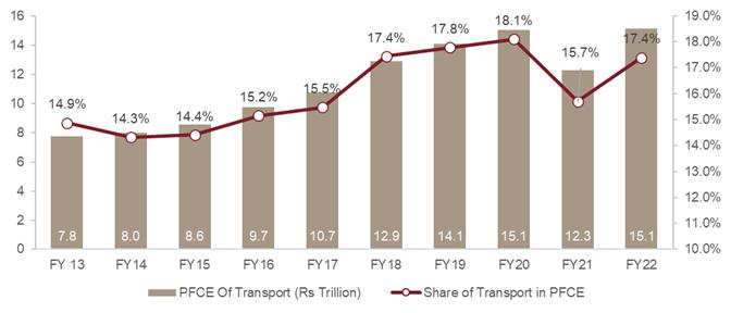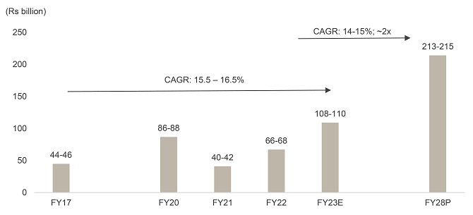 Port traffic in fiscal 2021 de-grew around 5%, while the past five-year CAGR was 2.2%. In fiscal 2022, traffic growth rebounded with 4.4% on-year growth. Growth in fiscal 2022 is majorly driven by key commodities coupled with the low base of fiscal 2021. Furthermore, port traffic is estimated to have grown by 8-9% in fiscal 2023. The growth in fiscal 2023 was primarily driven by the robust growth in coal cargo traffic on the back of higher domestic demand due to increased power requirements in the country.