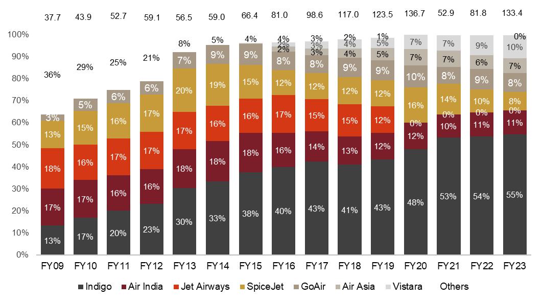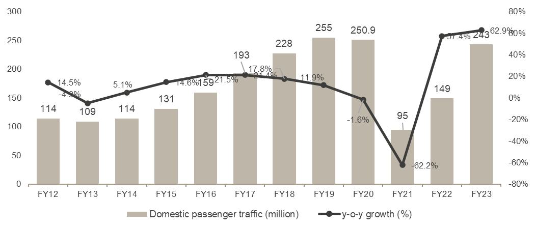 In fiscal 2023, domestic freight traffic has seen an on-year growth of ~12% to 725 thousand tonnes in fiscal 2023, surpassing pre-Covid highs attained in fiscal 2019, led by a low base, continued economic revival, rising demand from e-commerce and related sectors and increased capacity deployment by airlines.