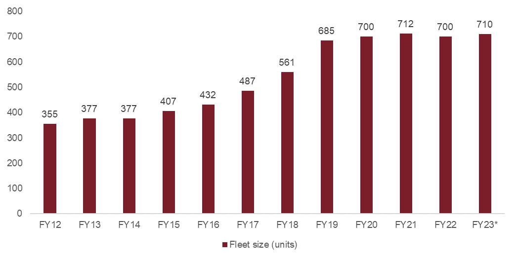 Led by these factors fiscal 2022 has seen a year-on-year growth of ~29% on a low pandemic impacted base of 1961 thousand tons in fiscal 2021. However, freight traffic is declined by ~5% on-year in fiscal 2023 to 1,865 thousand tons which can be attributable to drop-in sea freight rates and global economic pressure