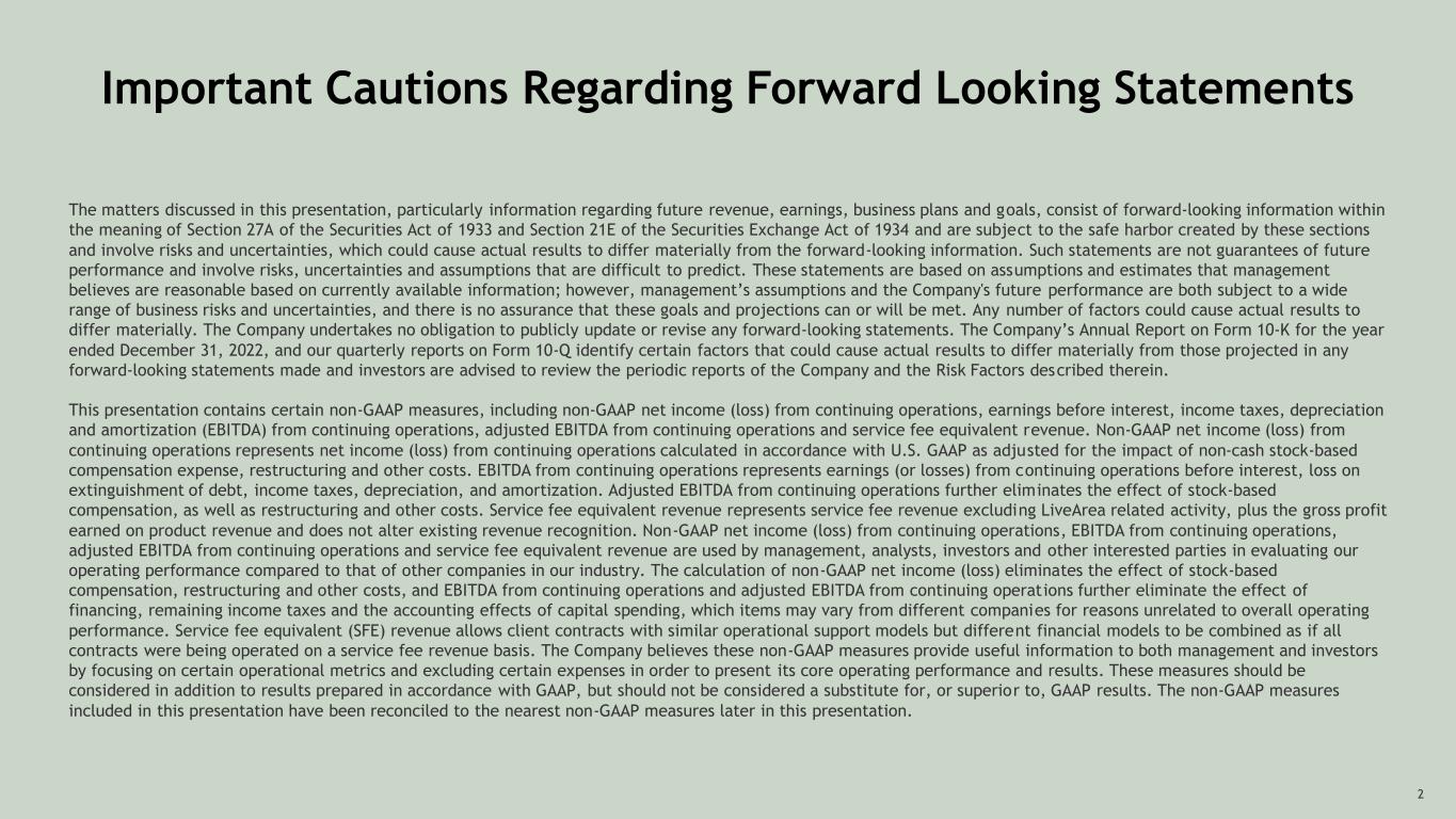Important Cautions Regarding Forward Looking Statements The matters discussed in this presentation, particularly information regarding future revenue, earnings, business plans and goals, consist of forward-looking information within the meaning of Section 27A of the Securities Act of 1933 and Section 21E of the Securities Exchange Act of 1934 and are subject to the safe harbor created by these sections and involve risks and uncertainties, which could cause actual results to differ materially from the forward-looking information. Such statements are not guarantees of future performance and involve risks, uncertainties and assumptions that are difficult to predict. These statements are based on assumptions and estimates that management believes are reasonable based on currently available information; however, management’s assumptions and the Company's future performance are both subject to a wide range of business risks and uncertainties, and there is no assurance that these goals and projections can or will be met. Any number of factors could cause actual results to differ materially. The Company undertakes no obligation to publicly update or revise any forward-looking statements. The Company’s Annual Report on Form 10-K for the year ended December 31, 2022, and our quarterly reports on Form 10-Q identify certain factors that could cause actual results to differ materially from those projected in any forward-looking statements made and investors are advised to review the periodic reports of the Company and the Risk Factors described therein. This presentation contains certain non-GAAP measures, including non-GAAP net income (loss) from continuing operations, earnings before interest, income taxes, depreciation and amortization (EBITDA) from continuing operations, adjusted EBITDA from continuing operations and service fee equivalent revenue. Non-GAAP net income (loss) from continuing operations represents net income (loss) from continuing operations calculated in accordance with U.S. GAAP as adjusted for the impact of non-cash stock-based compensation expense, restructuring and other costs. EBITDA from continuing operations represents earnings (or losses) from continuing operations before interest, loss on extinguishment of debt, income taxes, depreciation, and amortization. Adjusted EBITDA from continuing operations further eliminates the effect of stock-based compensation, as well as restructuring and other costs. Service fee equivalent revenue represents service fee revenue excluding LiveArea related activity, plus the gross profit earned on product revenue and does not alter existing revenue recognition. Non-GAAP net income (loss) from continuing operations, EBITDA from continuing operations, adjusted EBITDA from continuing operations and service fee equivalent revenue are used by management, analysts, investors and other interested parties in evaluating our operating performance compared to that of other companies in our industry. The calculation of non-GAAP net income (loss) eliminates the effect of stock-based compensation, restructuring and other costs, and EBITDA from continuing operations and adjusted EBITDA from continuing operations further eliminate the effect of financing, remaining income taxes and the accounting effects of capital spending, which items may vary from different companies for reasons unrelated to overall operating performance. Service fee equivalent (SFE) revenue allows client contracts with similar operational support models but different financial models to be combined as if all contracts were being operated on a service fee revenue basis. The Company believes these non-GAAP measures provide useful information to both management and investors by focusing on certain operational metrics and excluding certain expenses in order to present its core operating performance and results. These measures should be considered in addition to results prepared in accordance with GAAP, but should not be considered a substitute for, or superior to, GAAP results. The non-GAAP measures included in this presentation have been reconciled to the nearest non-GAAP measures later in this presentation. 2