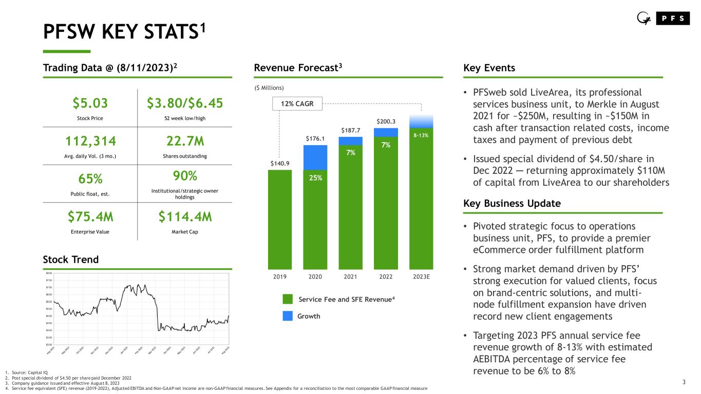 3 PFSW KEY STATS1 1. Source: Capital IQ 2. Post special dividend of $4.50 per share paid December 2022 3. Company guidance issued and effective August 8, 2023 4. Service fee equivalent (SFE) revenue (2019-2022), Adjusted EBITDA and Non-GAAP net income are non-GAAP financial measures. See Appendix for a reconciliation to the most comparable GAAP financial measure Key Events ($ Millions) Revenue Forecast3 $140.9 $176.1 $187.7 $200.3 2019 2020 2021 2022 2023E 25% 12% CAGR Service Fee and SFE Revenue4 Growth 7% • PFSweb sold LiveArea, its professional services business unit, to Merkle in August 2021 for ~$250M, resulting in ~$150M in cash after transaction related costs, income taxes and payment of previous debt • Issued special dividend of $4.50/share in Dec 2022 ─ returning approximately $110M of capital from LiveArea to our shareholders 8-13% Key Business Update • Pivoted strategic focus to operations business unit, PFS, to provide a premier eCommerce order fulfillment platform • Strong market demand driven by PFS’ strong execution for valued clients, focus on brand-centric solutions, and multi- node fulfillment expansion have driven record new client engagements • Targeting 2023 PFS annual service fee revenue growth of 8-13% with estimated AEBITDA percentage of service fee revenue to be 6% to 8% 7% $5.03 Stock Price $3.80/$6.45 52 week low/high 112,314 Avg. daily Vol. (3 mo.) 22.7M Shares outstanding 65% Public float, est. 90% Institutional/strategic owner holdings $75.4M Enterprise Value $114.4M Market Cap Stock Trend Trading Data @ (8/11/2023)2