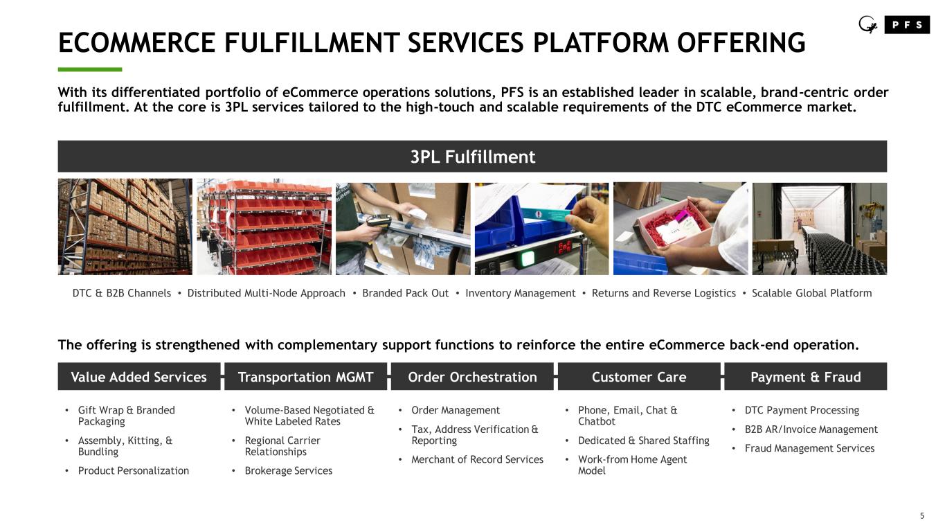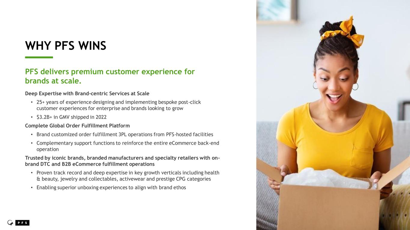 WHY PFS WINS ____ PFS delivers premium customer experience for brands at scale. Deep Expertise with Brand-centric Services at Scale • 25+ years of experience designing and implementing bespoke post-click customer experiences for enterprise and brands looking to grow • $3.2B+ in GMV shipped in 2022 Complete Global Order Fulfillment Platform • Brand customized order fulfillment 3PL operations from PFS-hosted facilities • Complementary support functions to reinforce the entire eCommerce back-end operation Trusted by iconic brands, branded manufacturers and specialty retailers with on- brand DTC and B2B eCommerce fulfillment operations • Proven track record and deep expertise in key growth verticals including health & beauty, jewelry and collectables, activewear and prestige CPG categories • Enabling superior unboxing experiences to align with brand ethos