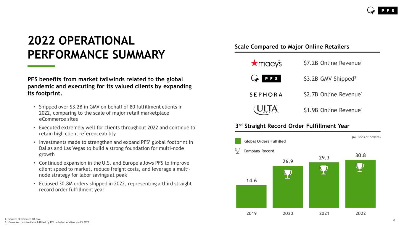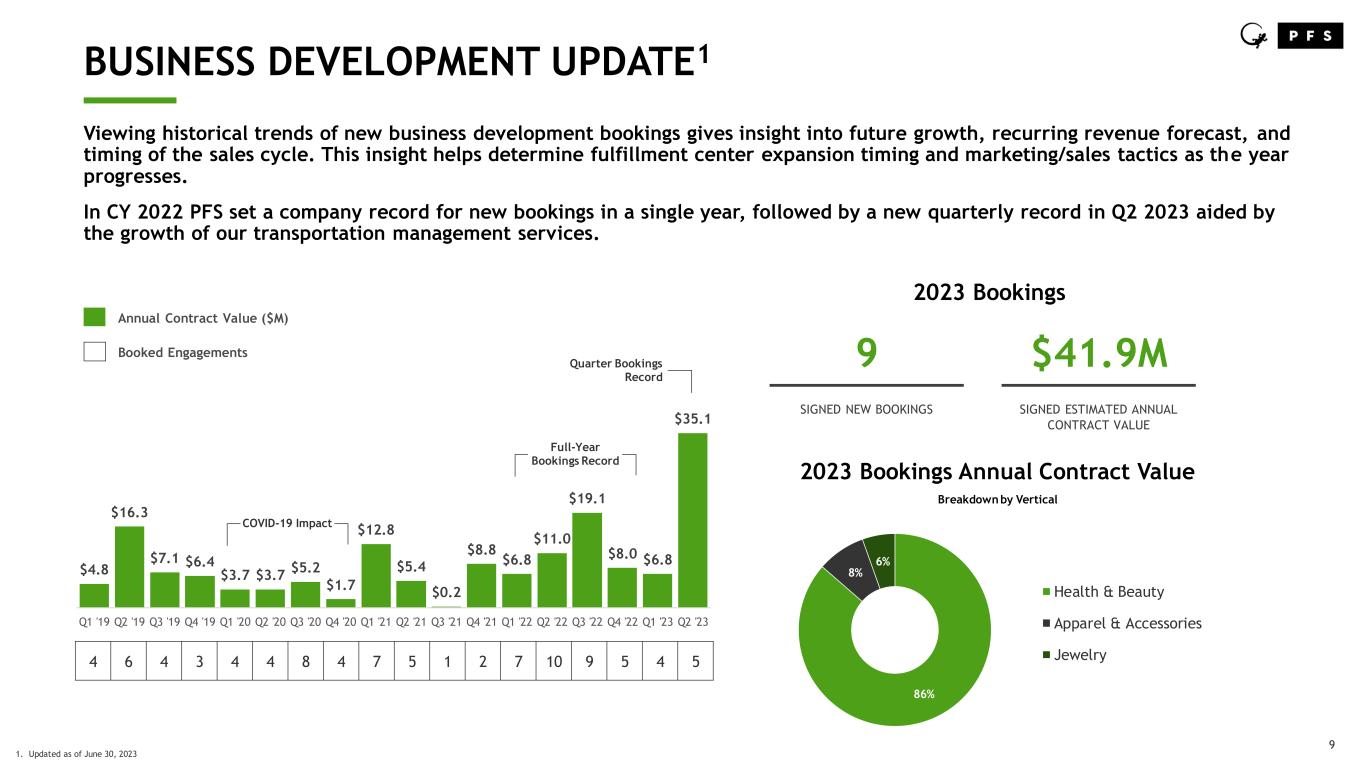 8 2022 OPERATIONAL PERFORMANCE SUMMARY ____ PFS benefits from market tailwinds related to the global pandemic and executing for its valued clients by expanding its footprint. • Shipped over $3.2B in GMV on behalf of 80 fulfillment clients in 2022, comparing to the scale of major retail marketplace eCommerce sites • Executed extremely well for clients throughout 2022 and continue to retain high client referenceability • Investments made to strengthen and expand PFS’ global footprint in Dallas and Las Vegas to build a strong foundation for multi-node growth • Continued expansion in the U.S. and Europe allows PFS to improve client speed to market, reduce freight costs, and leverage a multi- node strategy for labor savings at peak • Eclipsed 30.8M orders shipped in 2022, representing a third straight record order fulfillment year 14.6 26.9 29.3 30.8 2019 2020 2021 2022 3rd Straight Record Order Fulfillment Year Global Orders Fulfilled Company Record Scale Compared to Major Online Retailers $7.2B Online Revenue1 $3.2B GMV Shipped2 $2.7B Online Revenue1 1. Source: eCommerce DB.com 2. Gross Merchandise Value fulfilled by PFS on behalf of clients in FY 2022 $1.9B Online Revenue1 (Millions of orders)