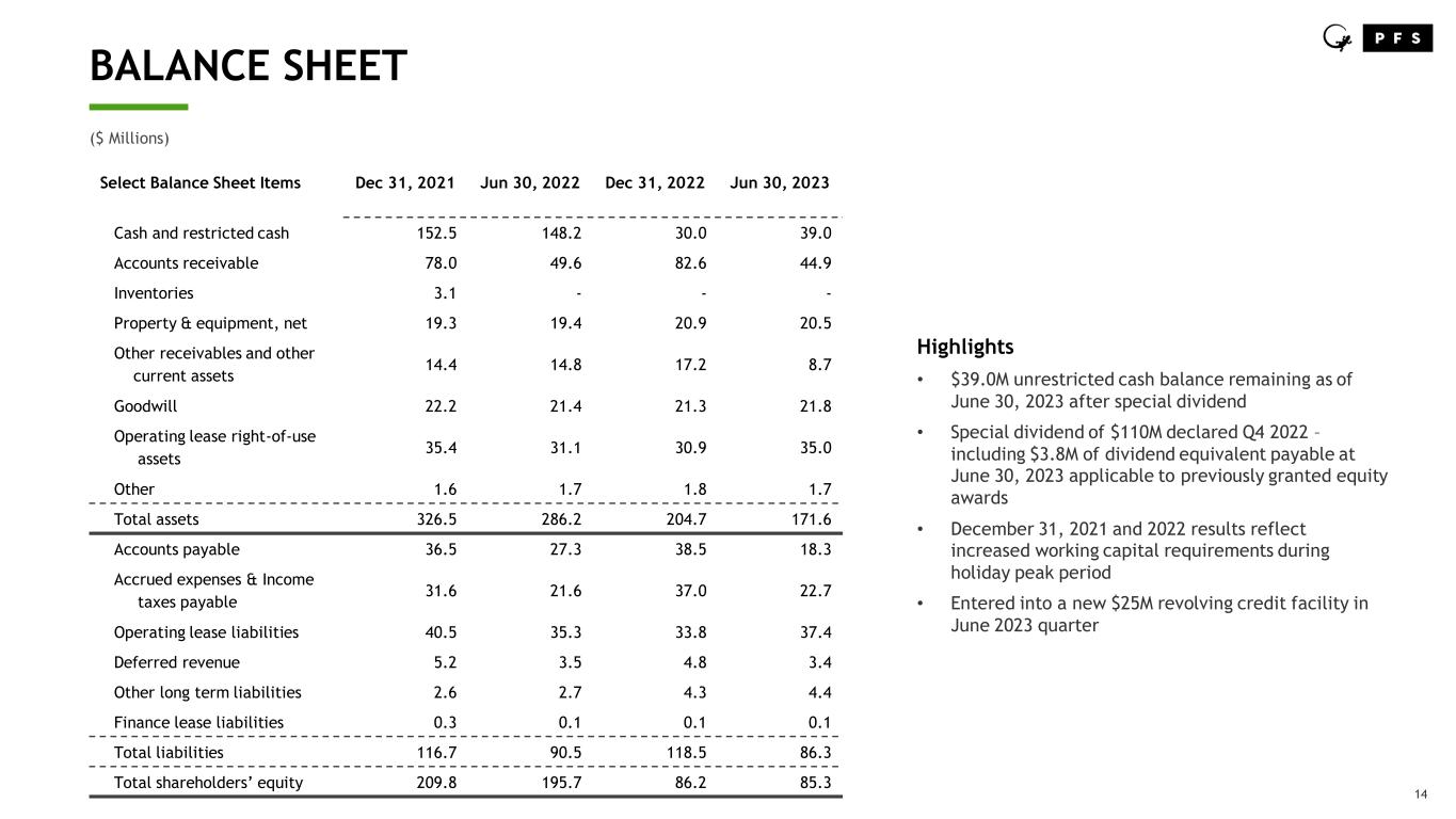 13 $200.3 2022 2023E 2023 OUTLOOK PFS expects substantial improvement in consolidated AEBITDA as compared to CY2022 as a result of improving gross margins and cost restructuring to better align to the current company size and focus. Service Fee and SFE Revenue1 Targeting growth of 8% to 13% range driven by strong, sustained fulfillment demand strength and transportation management services AEBITDA Estimated AEBITDA profitability for the business operating in a public company environment with certain corporate public company related costs Estimated Public Company Costs Estimated costs associated with operating as a publicly traded company 8-13% Growth ~$216 - $226 Service Fee and SFE Revenue1 2023E 8%-10% of Service Fee Rev 6%-8% ~2% ($ Millions) AEBITDA 1. Service Fee Equivalent Revenue (2022) is a non-GAAP financial measures. See Appendix for a reconciliation to the most comparable GAAP financial measure. 2. Company guidance issued and effective August 8, 2023 2 2