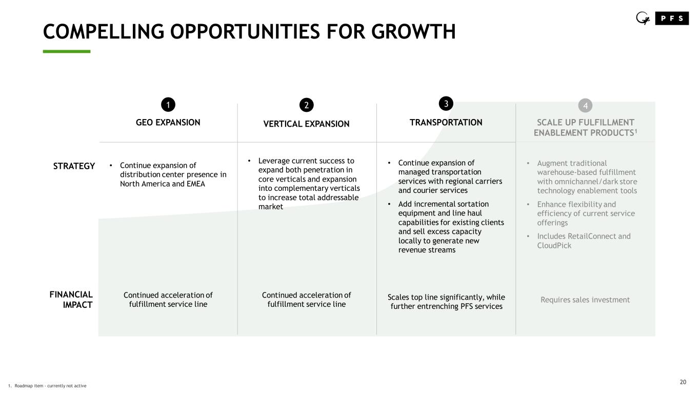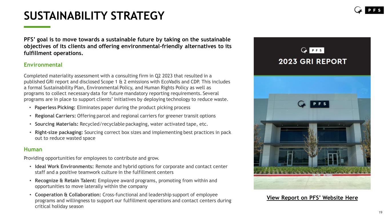 19 SUSTAINABILITY STRATEGY ____ PFS’ goal is to move towards a sustainable future by taking on the sustainable objectives of its clients and offering environmental-friendly alternatives to its fulfillment operations. Environmental Completed materiality assessment with a consulting firm in Q2 2023 that resulted in a published GRI report and disclosed Scope 1 & 2 emissions with EcoVadis and CDP. This includes a formal Sustainability Plan, Environmental Policy, and Human Rights Policy as well as programs to collect necessary data for future mandatory reporting requirements. Several programs are in place to support clients’ initiatives by deploying technology to reduce waste. • Paperless Picking: Eliminates paper during the product picking process • Regional Carriers: Offering parcel and regional carriers for greener transit options • Sourcing Materials: Recycled/recyclable packaging, water activated tape, etc. • Right-size packaging: Sourcing correct box sizes and implementing best practices in pack out to reduce wasted space Human Providing opportunities for employees to contribute and grow. • Ideal Work Environments: Remote and hybrid options for corporate and contact center staff and a positive teamwork culture in the fulfillment centers • Recognize & Retain Talent: Employee award programs, promoting from within and opportunities to move laterally within the company • Cooperation & Collaboration: Cross-functional and leadership support of employee programs and willingness to support our fulfillment operations and contact centers during critical holiday season View Report on PFS’ Website Here
