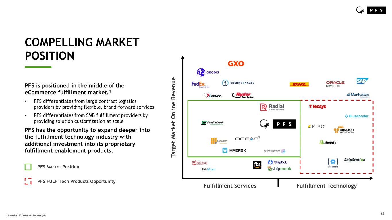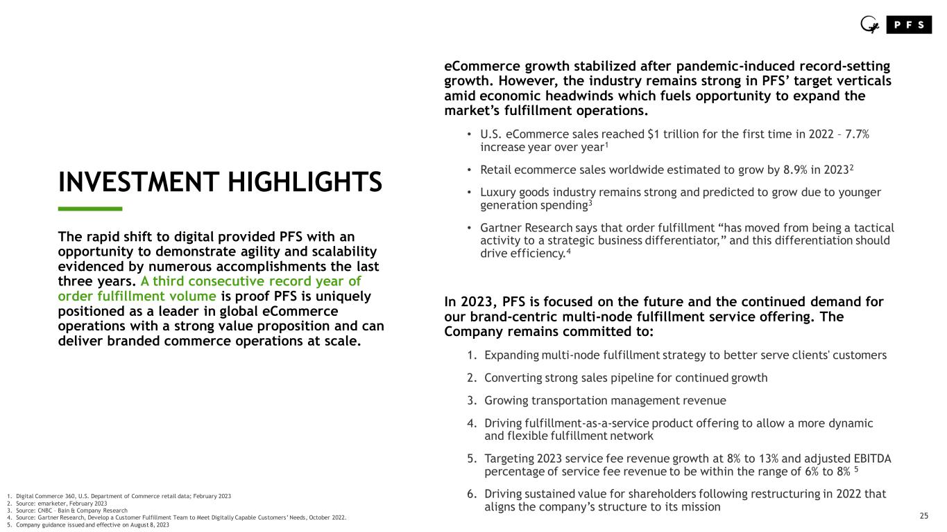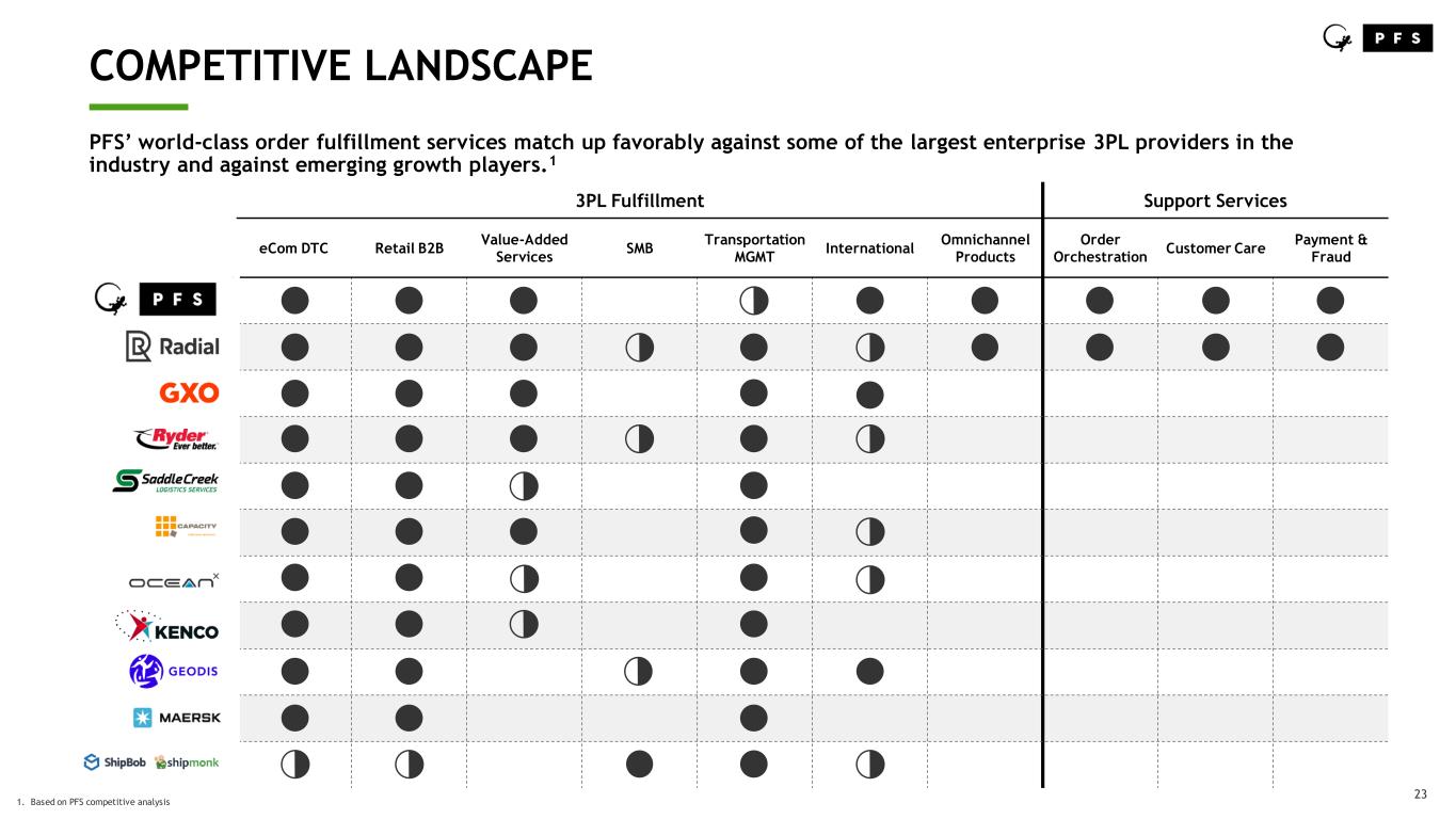 22 COMPELLING MARKET POSITION ____ PFS is positioned in the middle of the eCommerce fulfillment market.1 • PFS differentiates from large contract logistics providers by providing flexible, brand-forward services • PFS differentiates from SMB fulfillment providers by providing solution customization at scale PFS has the opportunity to expand deeper into the fulfillment technology industry with additional investment into its proprietary fulfillment enablement products. T a rg e t M a rk e t O n li n e R e v e n u e Fulfillment Services Fulfillment Technology PFS Market Position PFS FULF Tech Products Opportunity 1. Based on PFS competitive analysis