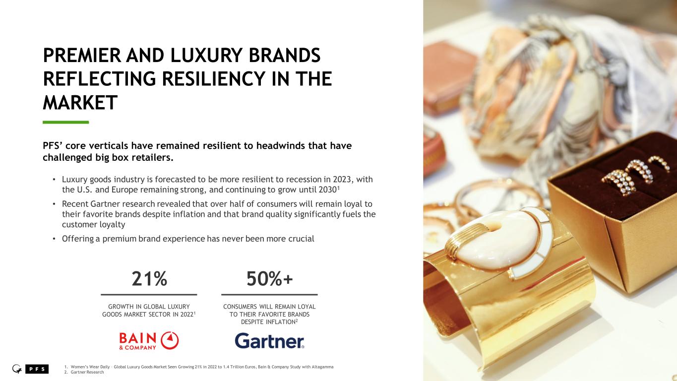 PREMIER AND LUXURY BRANDS REFLECTING RESILIENCY IN THE MARKET ____ PFS’ core verticals have remained resilient to headwinds that have challenged big box retailers. • Luxury goods industry is forecasted to be more resilient to recession in 2023, with the U.S. and Europe remaining strong, and continuing to grow until 20301 • Recent Gartner research revealed that over half of consumers will remain loyal to their favorite brands despite inflation and that brand quality significantly fuels the customer loyalty • Offering a premium brand experience has never been more crucial 21% GROWTH IN GLOBAL LUXURY GOODS MARKET SECTOR IN 20221 50%+ CONSUMERS WILL REMAIN LOYAL TO THEIR FAVORITE BRANDS DESPITE INFLATION2 1. Women’s Wear Daily – Global Luxury Goods Market Seen Growing 21% in 2022 to 1.4 Trillion Euros, Bain & Company Study with Altagamma 2. Gartner Research