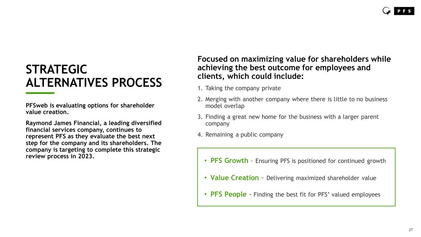 27 STRATEGIC ALTERNATIVES PROCESS PFSweb is evaluating options for shareholder value creation. Raymond James Financial, a leading diversified financial services company, continues to represent PFS as they evaluate the best next step for the company and its shareholders. The company is targeting to complete this strategic review process in 2023. Focused on maximizing value for shareholders while achieving the best outcome for employees and clients, which could include: 1. Taking the company private 2. Merging with another company where there is little to no business model overlap 3. Finding a great new home for the business with a larger parent company 4. Remaining a public company • PFS Growth – Ensuring PFS is positioned for continued growth • Value Creation – Delivering maximized shareholder value • PFS People - Finding the best fit for PFS’ valued employees
