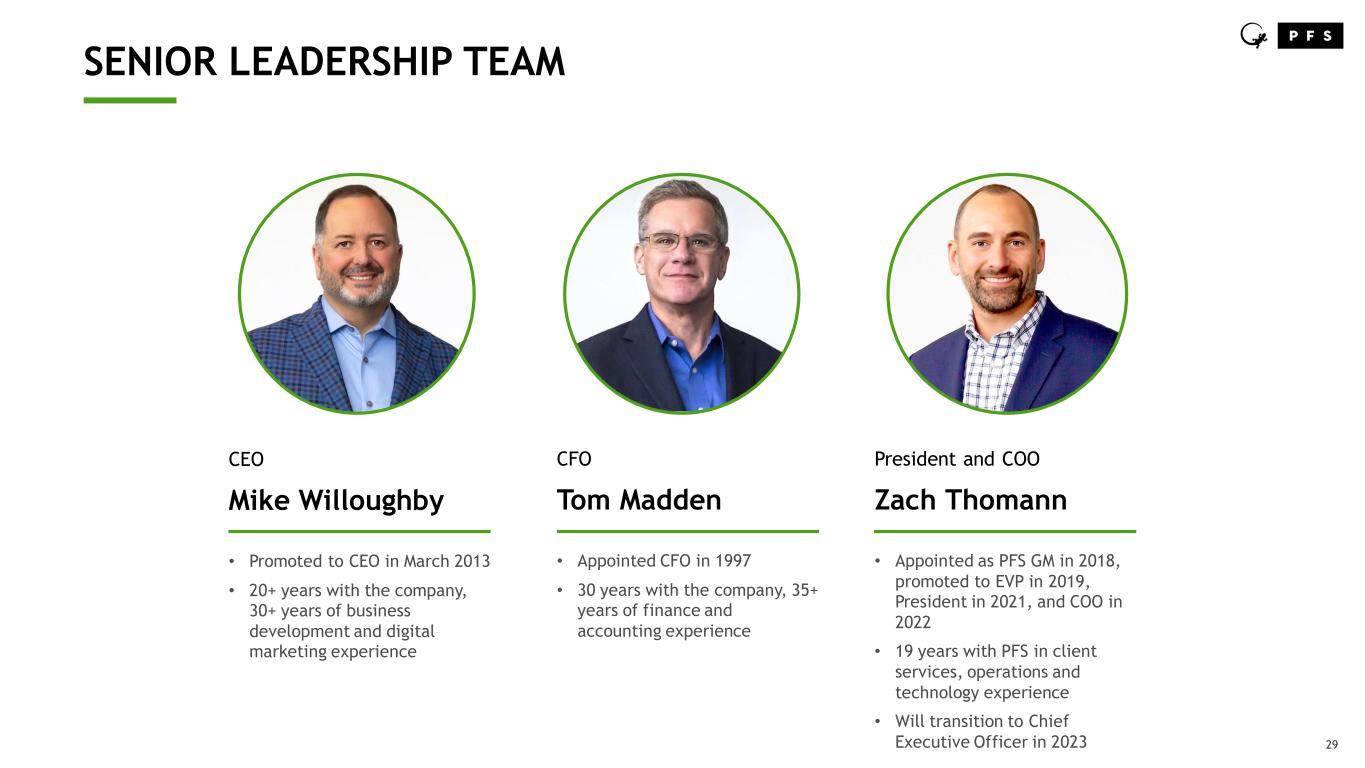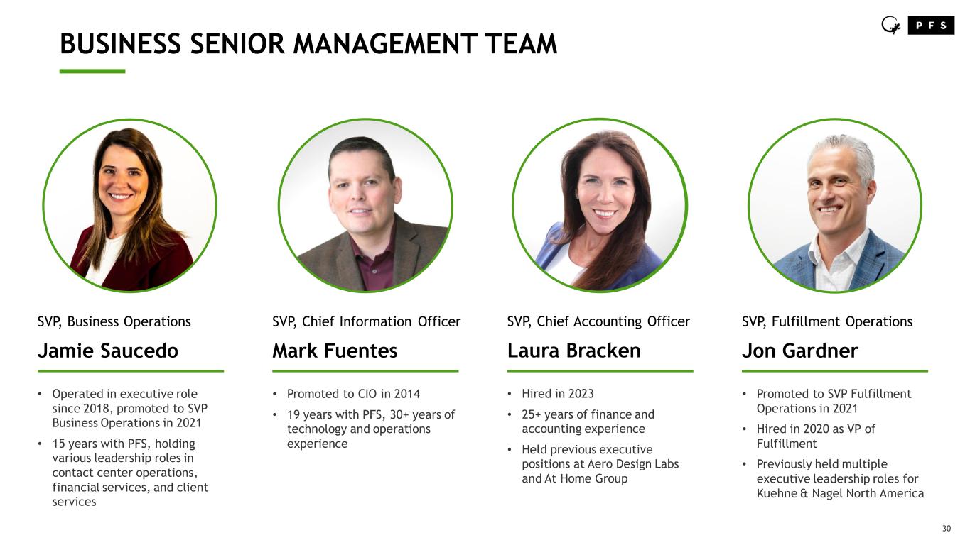 29 SENIOR LEADERSHIP TEAM CEO Mike Willoughby • Promoted to CEO in March 2013 • 20+ years with the company, 30+ years of business development and digital marketing experience CFO Tom Madden • Appointed CFO in 1997 • 30 years with the company, 35+ years of finance and accounting experience President and COO Zach Thomann • Appointed as PFS GM in 2018, promoted to EVP in 2019, President in 2021, and COO in 2022 • 19 years with PFS in client services, operations and technology experience • Will transition to Chief Executive Officer in 2023
