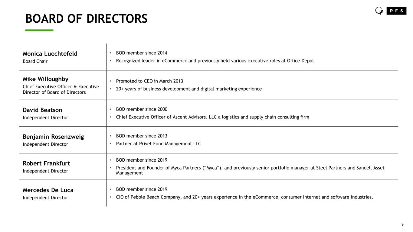 30 SVP, Chief Information Officer Mark Fuentes • Promoted to CIO in 2014 • 19 years with PFS, 30+ years of technology and operations experience SVP, Chief Accounting Officer Laura Bracken • Hired in 2023 • 25+ years of finance and accounting experience • Held previous executive positions at Aero Design Labs and At Home Group SVP, Fulfillment Operations Jon Gardner • Promoted to SVP Fulfillment Operations in 2021 • Hired in 2020 as VP of Fulfillment • Previously held multiple executive leadership roles for Kuehne & Nagel North America SVP, Business Operations Jamie Saucedo • Operated in executive role since 2018, promoted to SVP Business Operations in 2021 • 15 years with PFS, holding various leadership roles in contact center operations, financial services, and client services BUSINESS SENIOR MANAGEMENT TEAM