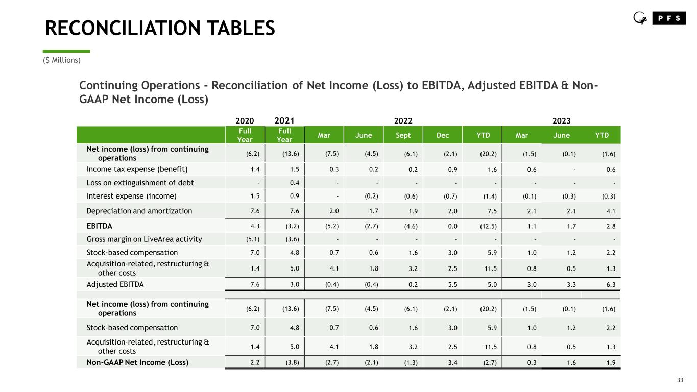 32 HISTORICAL SERVICE FEE EQUIVALENT REVENUE OVERVIEW • Service Fee Revenue represents PFS’ primary business activity across more than 100+ brands ‒ No inventory ownership required ‒ Generates service fees based on recurring transaction-based activity and projects • FY2022 activity ‒ Over $3.2B in client merchandise fulfilled ‒ This generated $200.0M GAAP Service Fee Revenue or $200.3M Service Fee Equivalent Revenue Service Fee Revenue • PFS’ Product Revenue activity relates to one specific client ‒ The client agreement required PFS to take title of their inventory and U.S. GAAP required PFS to record the full value of their merchandise sold as Product Revenue ‒ Gross profit of Product Revenue was therefore the best estimate of service fees ‒ Agreement with this client ended mid 2022 Product Revenue 2019(1) 2020 2021 2022 2023 Full Year Full Year Full Year Mar June Sept Dec YTD Mar June YTD Total PFSW revenue 294.0 272.9 277.3 66.5 64.6 65.5 98.5 295.1 69.3 67.9 137.2 Pass-through revenue (53.0) (62.0) (64.2) (17.8) (19.2) (21.8) (32.9) (91.7) (21.7) (19.7) (41.4) Cost of Product Revenue (25.2) (21.7) (16.6) (2.9) (0.2) - - (3.1) - - - Service fee revenue related to LiveArea activity (2) (74.9) (13.1) (8.8) - - - - - - - - PFS Service Fee Equivalent Revenue 140.9 176.1 187.7 45.8 45.2 43.7 65.6 200.3 47.6 48.2 95.8 (1) Service fee equivalent revenues for 2019 based on amounts as filed in our Form 10-K for the year ended December 31, 2019, and have not been affected for discontinued operations presentation related to the divestiture of our LiveArea business in 2021. (2) In completing the discontinued operations presentation, certain LiveArea revenues, costs of revenues and gross profit related to client contracts that were not fully transferred to contracts directly operating under the LiveArea operating entities as of the August 2021 transaction date were maintained by PFS as part of the continuing operations presentation. Subsequent to the LiveArea transaction date, revenues billed and costs incurred under these certain contracts where we have subcontracted services to LiveArea are recorded as pass-through revenue and pass-through costs, for as long as such contracts continue to be maintained directly through PFS.