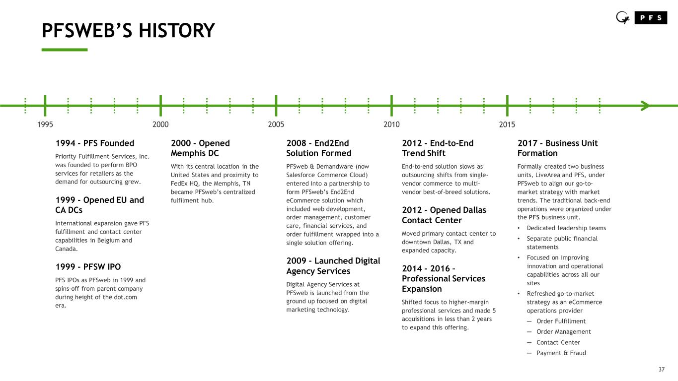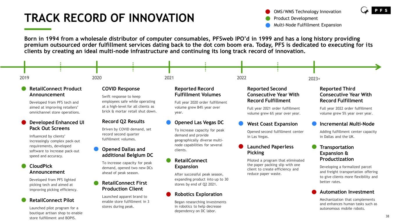 37 PFSWEB’S HISTORY 2000 2005 20101995 2015 2008 - End2End Solution Formed PFSweb & Demandware (now Salesforce Commerce Cloud) entered into a partnership to form PFSweb’s End2End eCommerce solution which included web development, order management, customer care, financial services, and order fulfillment wrapped into a single solution offering. 2009 - Launched Digital Agency Services Digital Agency Services at PFSweb is launched from the ground up focused on digital marketing technology. 2012 - End-to-End Trend Shift End-to-end solution slows as outsourcing shifts from single- vendor commerce to multi- vendor best-of-breed solutions. 2012 - Opened Dallas Contact Center Moved primary contact center to downtown Dallas, TX and expanded capacity. 2014 - 2016 – Professional Services Expansion Shifted focus to higher-margin professional services and made 5 acquisitions in less than 2 years to expand this offering. 1994 - PFS Founded Priority Fulfillment Services, Inc. was founded to perform BPO services for retailers as the demand for outsourcing grew. 1999 - Opened EU and CA DCs International expansion gave PFS fulfillment and contact center capabilities in Belgium and Canada. 1999 - PFSW IPO PFS IPOs as PFSweb in 1999 and spins-off from parent company during height of the dot.com era. 2000 - Opened Memphis DC With its central location in the United States and proximity to FedEx HQ, the Memphis, TN became PFSweb’s centralized fulfilment hub. 2017 - Business Unit Formation Formally created two business units, LiveArea and PFS, under PFSweb to align our go-to- market strategy with market trends. The traditional back-end operations were organized under the PFS business unit. • Dedicated leadership teams • Separate public financial statements • Focused on improving innovation and operational capabilities across all our sites • Refreshed go-to-market strategy as an eCommerce operations provider ─ Order Fulfillment ─ Order Management ─ Contact Center ─ Payment & Fraud
