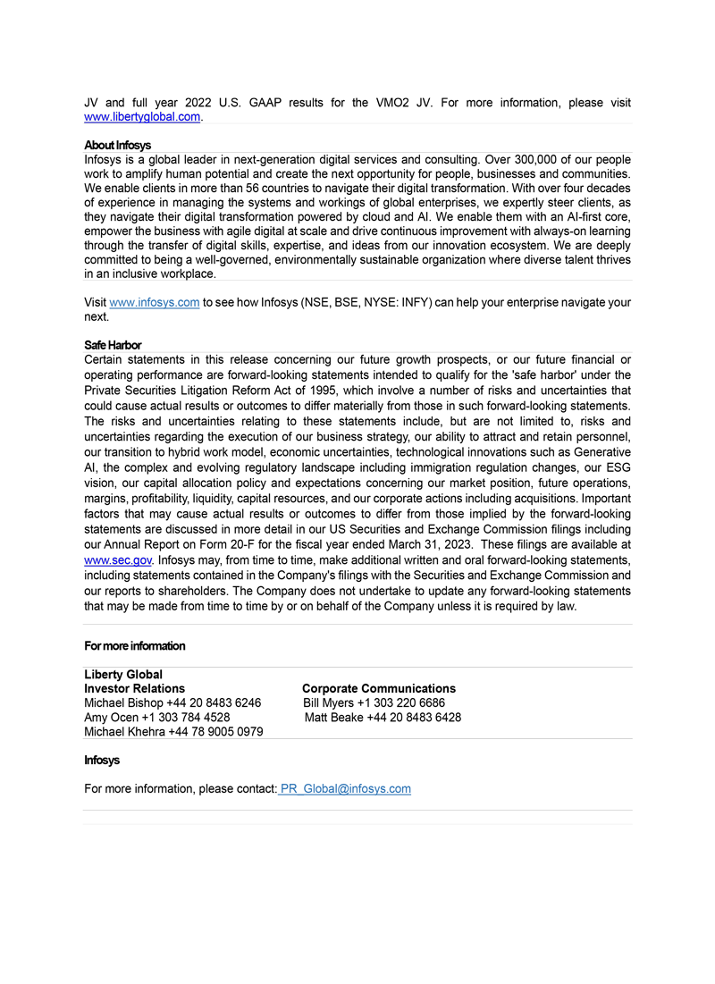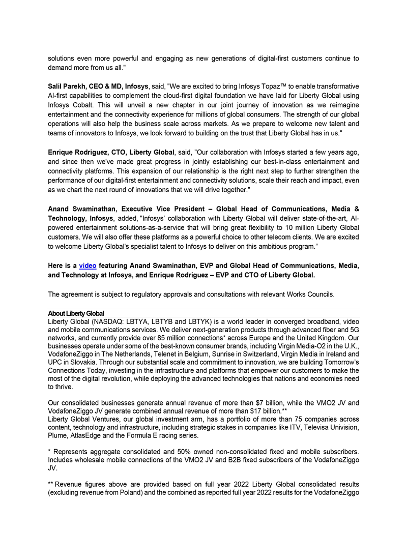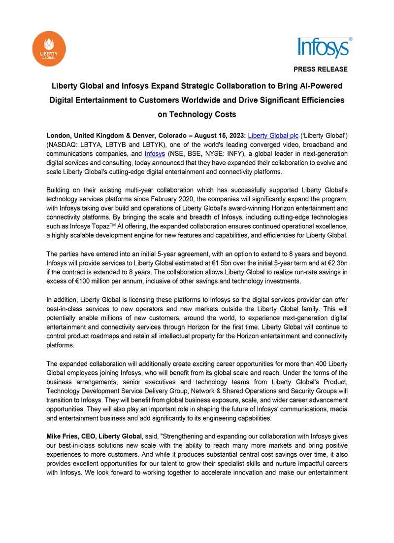 | 99.1 | Press Release - Liberty Global and Infosys Expand Strategic Collaboration to Bring AI-Powered Digital Entertainment to Customers Worldwide and Drive Significant Efficiencies on Technology Costs. |